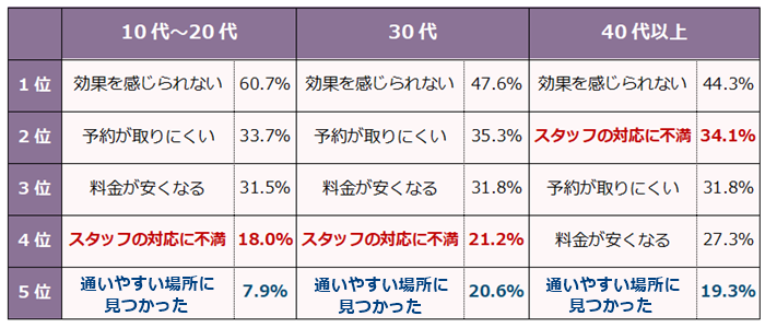 40代以上では「スタッフの対応」が乗り換え理由となる人が、10代~30代よりも15%前後多くなっています。スタッフの対応に関しては、「接客態度が悪いこと」のほか、「接客スタイルが好みでないこと」を乗り換え理由にあげた人も目立ちました。