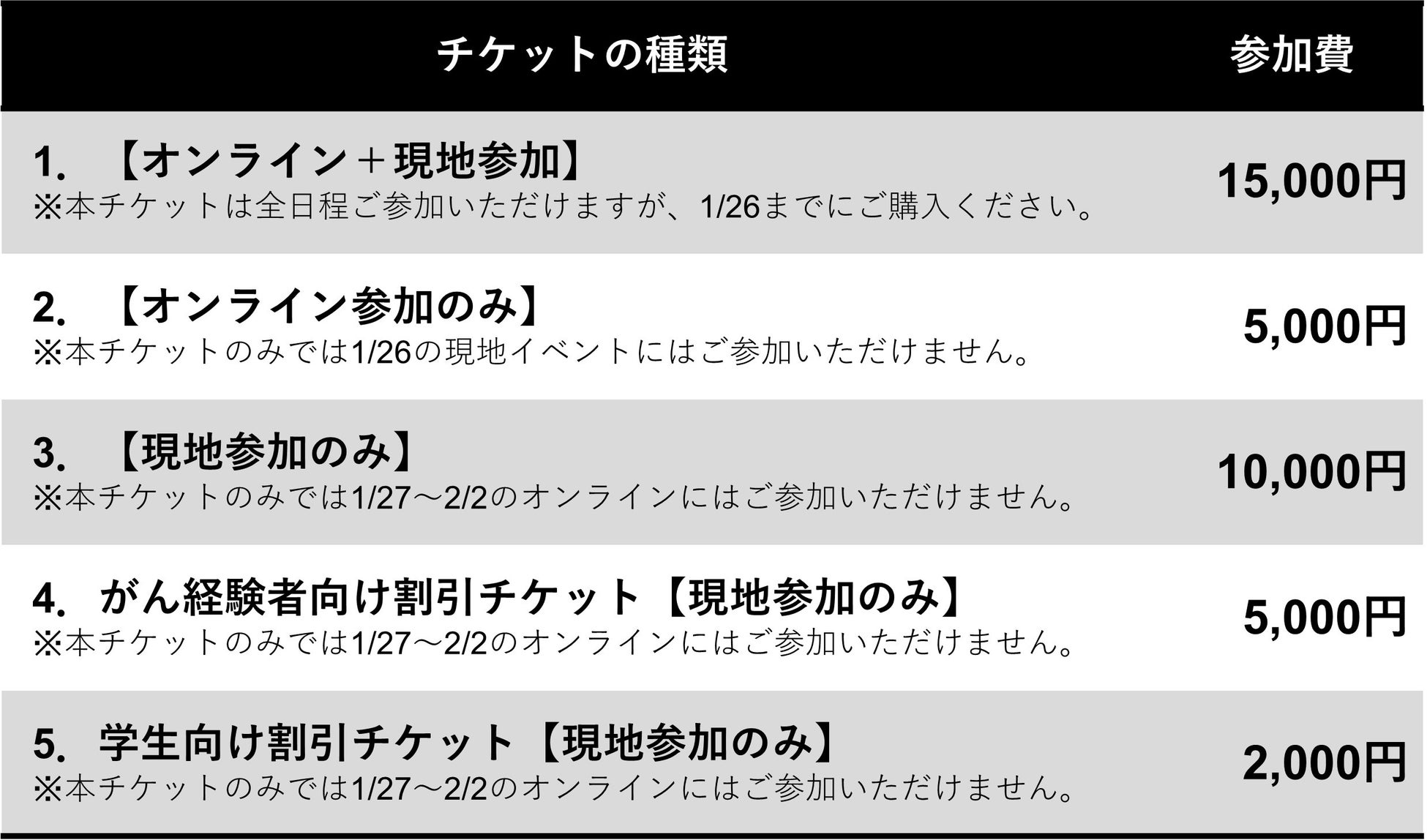 World Cancer Week2025では、ご希望の参加方法に合わせて3種類のチケットを発売します。