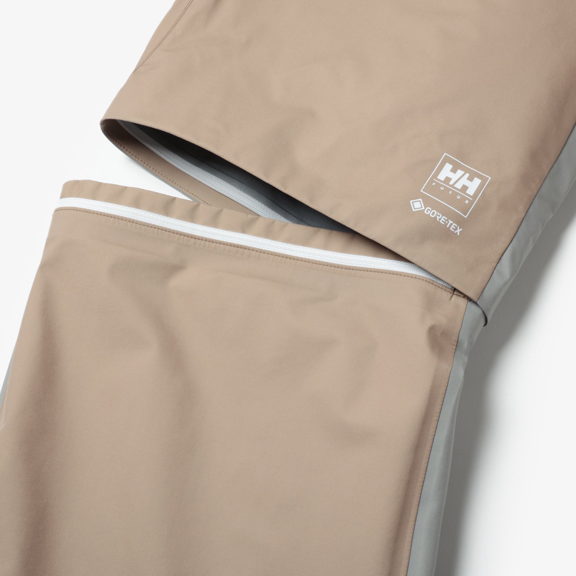 NORTH GORE-TEX JACKETとセットアップでの着用をイメージしたGORE-TEX素材の防水2WAYパンツが、FUTURのデザインとHELLY HANSENの技術が融合しました。最大の特徴は、ひざ下部分をファスナーで取り外し、ショーツにもできる2WAY仕様。ウエストはゴムシャーリング+スピンドル仕様でイージーパンツとしても着用が可能です。素材には、 GORE-TEX PRODUCTS 30D ナイロンタフタ 3L C knitを使用、優れた防水透湿性や防風性を備えながら、軽くてしなやかな穿き心地と肌側は柔らかなタッチ感になっています。ジャケット同様にFUTURの代表作であるNORTH JACKETをイメージした切り替えデザインで、バックには斜めにフラップポケットがついています。裾口にはドローコードが入っており、雨天時には裾を絞って水の浸入を軽減でき、晴れている時にはシルエットを変えてスタイリングを楽しむことができます。左前身頃には HELLY HANSENとFUTURのオリジナルロゴ、内側にはオリジナルデザインの織ネームなど、当コラボレーション限定の仕様が随所にあしらわれています。