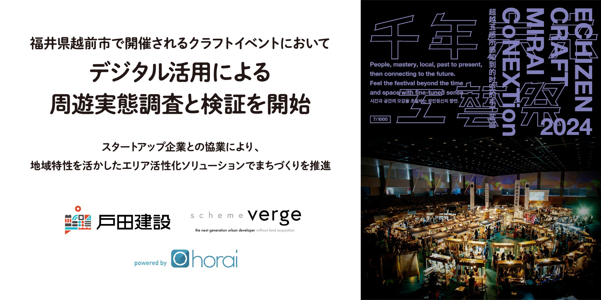 戸田建設(株)(本社:東京都中央区、社長:大谷 清介)は、scheme verge(株)(本社:東京都文京区、代表取締役CEO:嶂南 達貴)と協業し、北陸新幹線 越前たけふ駅周辺エリアの活性化を目指したまちづくりを推進しております。その一環として、モノづくりのまち越前市から様々なクラフトの魅力を伝えるイベント『千年未来工藝祭※1』において、アンケート調査およびデジタルクーポンを活用した周遊実態調査と検証(以下、本調査)を行います。