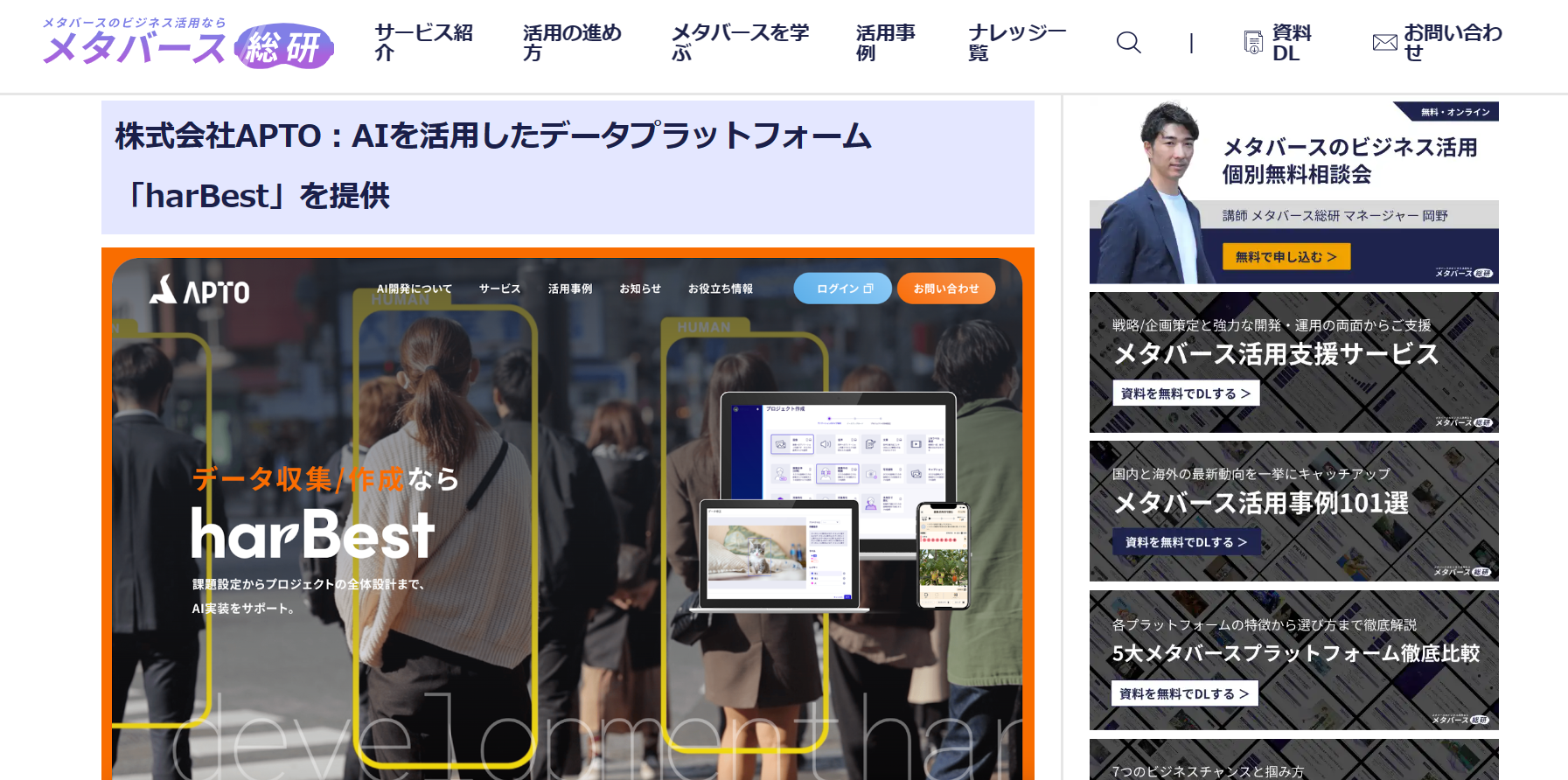株式会社APTOが運営するプラットフォームサービス「harBest」がメタバース総研様が選ぶ【2023年最新】おススメの企業向けAI関連サービス・開発会社まとめに掲載されました。