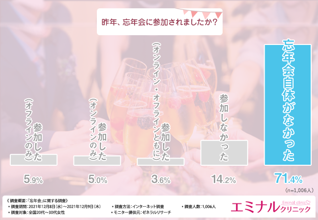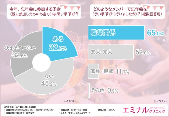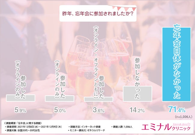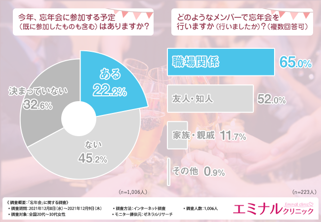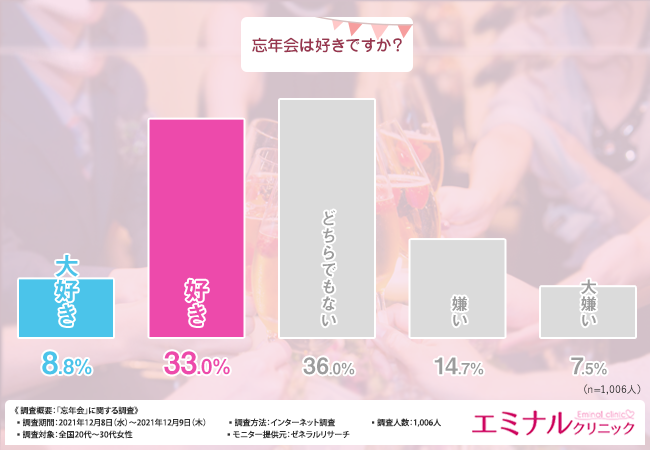 そこで今回、医療脱毛のエミナルクリニック(https://eminal-clinic.jp/)は、全国20代~30代女性を対象に、「忘年会」に関する調査を実施しました。