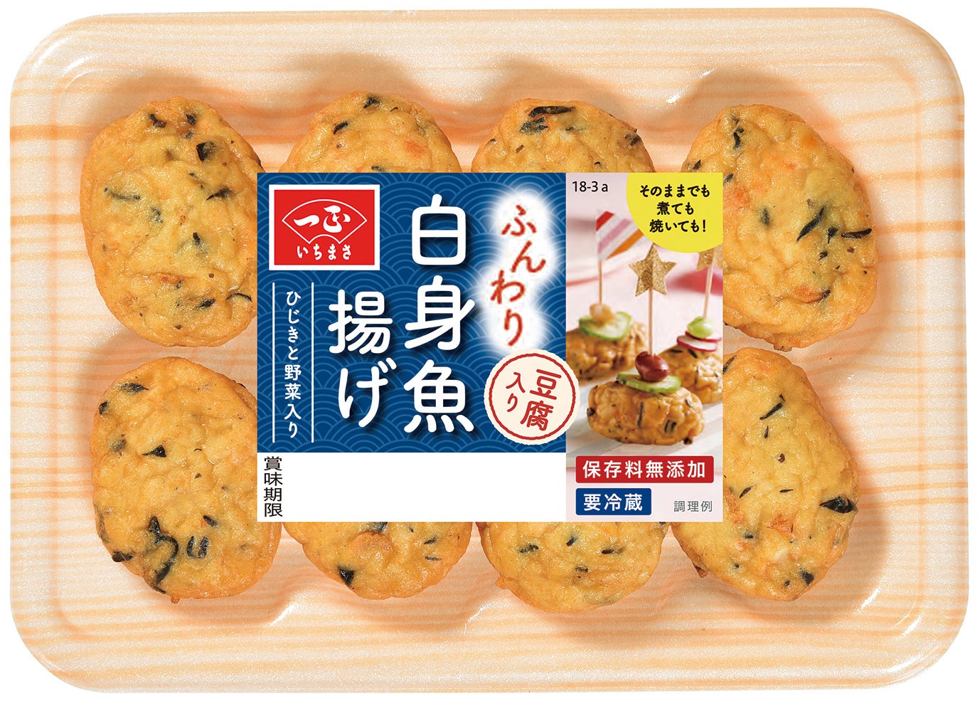 「白身魚揚げ たけのこ」は、いちまさの人気商品「白身魚揚げ」に「たけのこ」を加えた春にぴったりの商品です。豆腐を使用したふんわりソフトな口当たりに、「たけのこ」のシャキッとした食感がアクセントになっています。かつおだしの旨みがきいた土佐煮風の味付けで、そのままでもおいしくお召し上がりいただけますので、お弁当のおかずにおすすめです。また、煮物や和風サラダにプラスすると、春らしい一品に仕上がります。