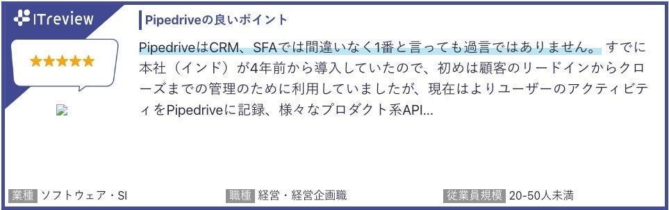 「Pipedrive」は、ITreviewで平均★4.6(2025年6月30日時点)という高評価を獲得し、実際のユーザーからも「営業プロセスの効率化が劇的に進んだ」「使いやすいUIで、誰でも簡単に操作できる」などの声をいただいています。当製品のご利用者様から実際に寄せられたレビューを一部ご紹介します。