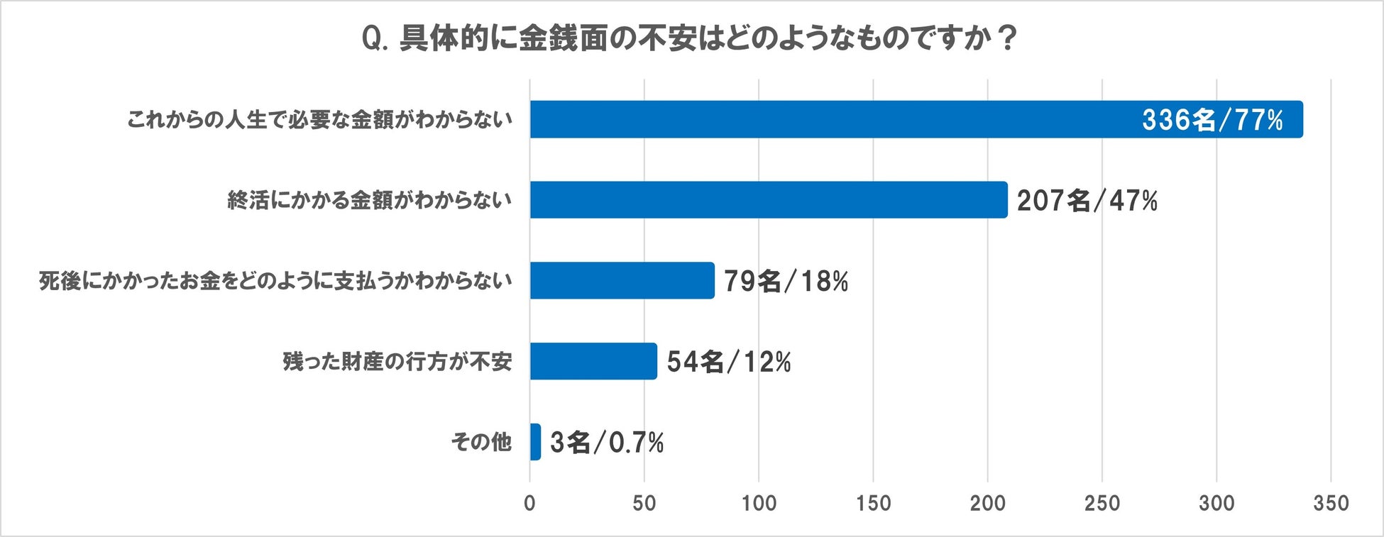 具体的な金銭面の不安として上位にあがったのが 「これからの人生で必要な金額がわからない」77%、「終活にかかる金額がわからない」47% 生きている間にかかる費用の予測を立てられないことによる不安が多い |