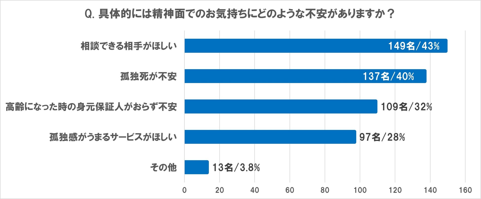 ■具体的な「精神面」についての不安は、「相談できる相手がほしい」43%、「孤独死」40%など