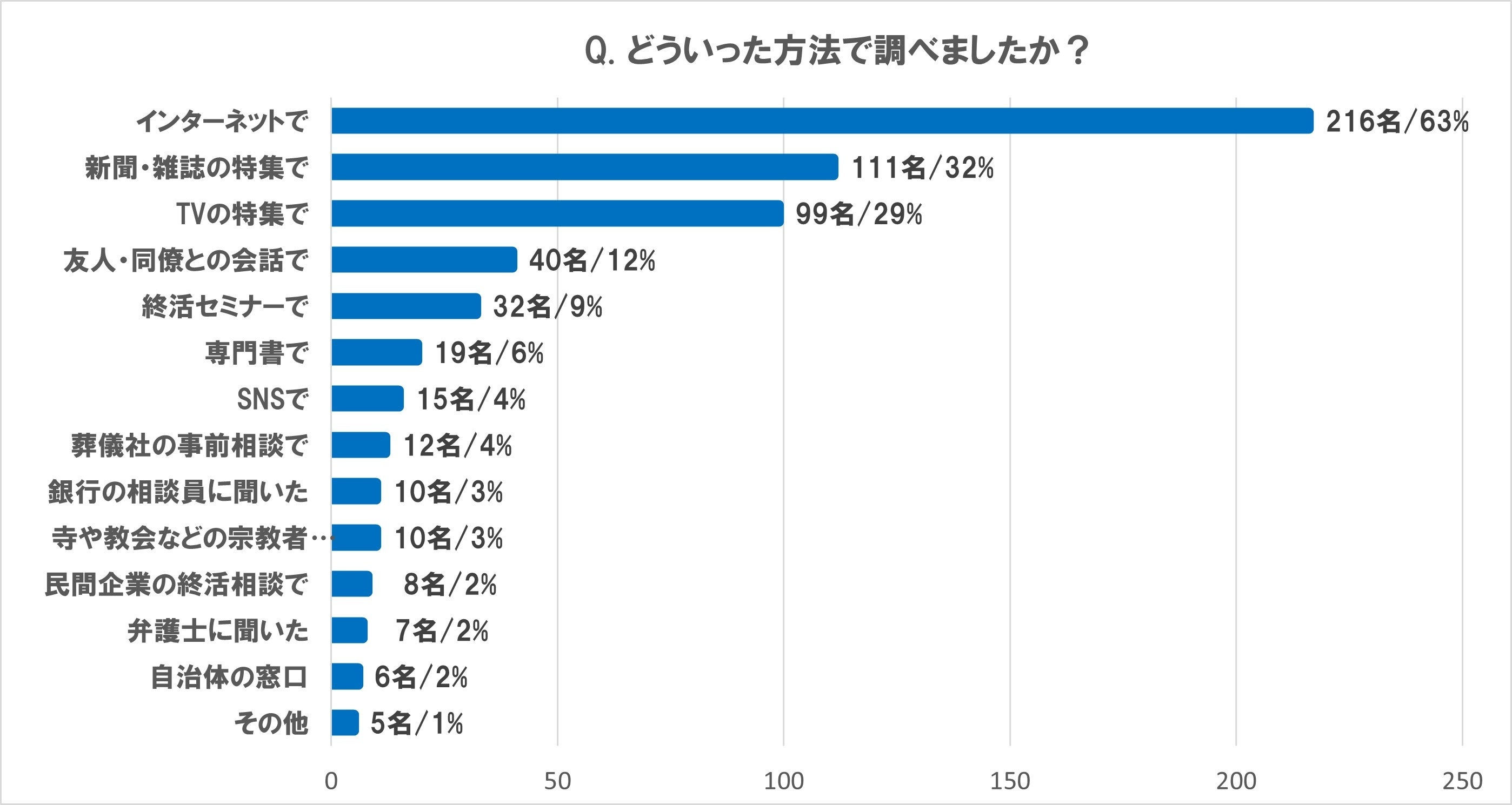 終活について調べた方法は、「インターネット」63%、「新聞・雑誌の特集」32%、 「TVの特集」29%といった、情報収集しやすい方法が上位を占める |