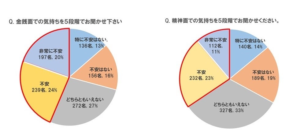 老後について5段階で気持ちを聞いたところ、 “非常に不安”、“不安”を合わせると、「金銭面」は44%、「精神面」は34% |