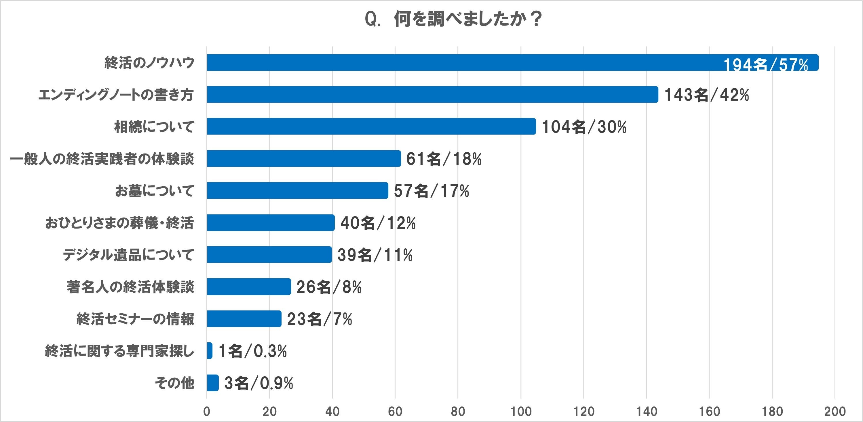 「終活のノウハウ」57%、「エンディングノートの書き方」42%など、終活のやり方を調べる人が多い |