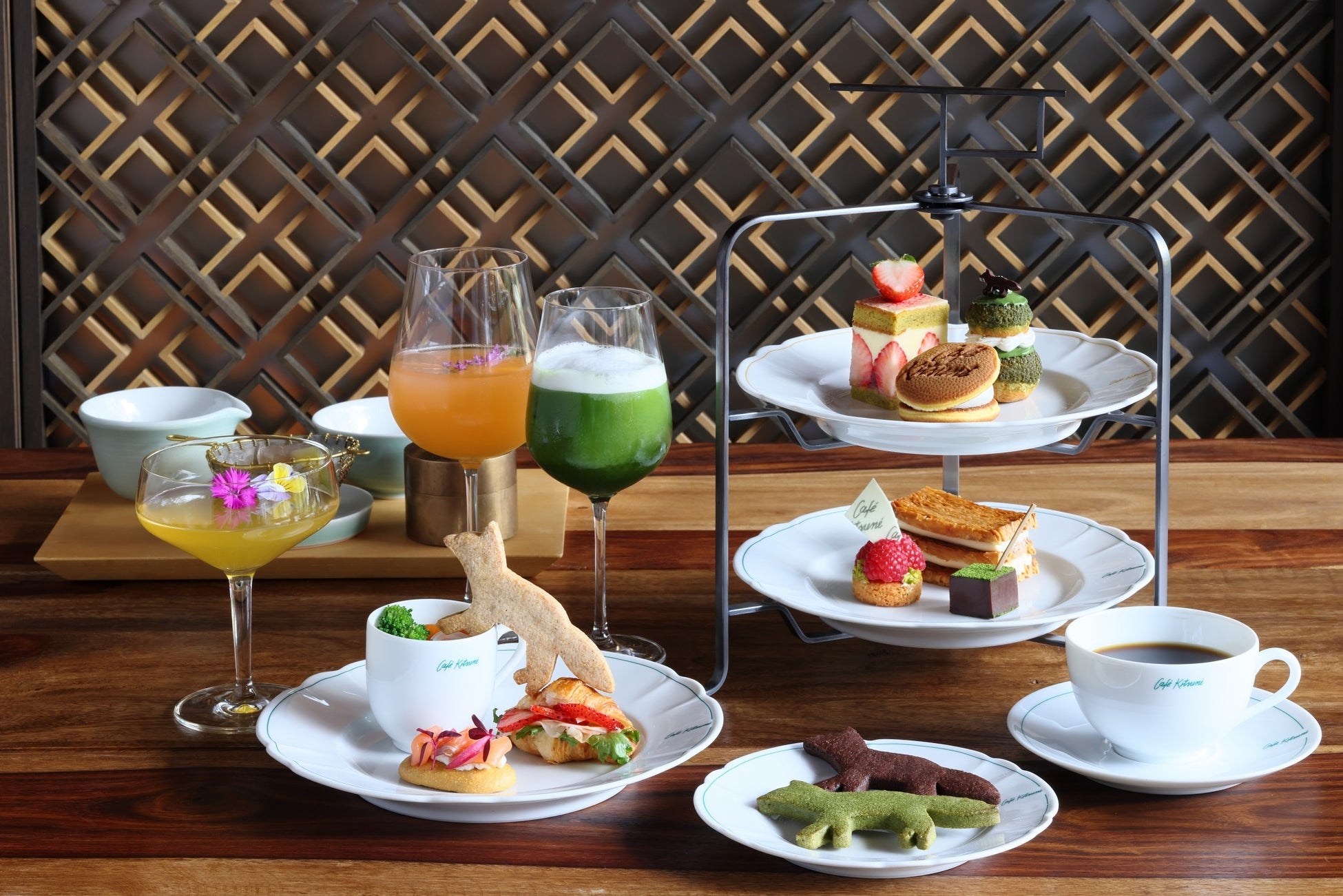 “八女茶”のウエルカムドリンクに始まり、仏の伝統菓子を抹茶を用いて作り上げた“Religieuse Matcha”、スペシャルティコーヒーのクリームをサンドした “Dorayaki café”。そして、京都産ポークと苺のクロワッサンサンドなどオーセンティックなパリを感じるセイボリー。HOTEL THE MITSUI KYOTOでしか味わえないチーズ味を含む3種の「Kitsuné Sablé」とトッピングしてお愉しみください。岡山のロースタリーから届くスペシャルティコーヒーやオリジナルモクテルにも注目を。日本とパリをめぐる魅力を「Café Kitsuné」の世界観とともに味わう、新鮮な驚きに満ちたティータイムをお届けします。