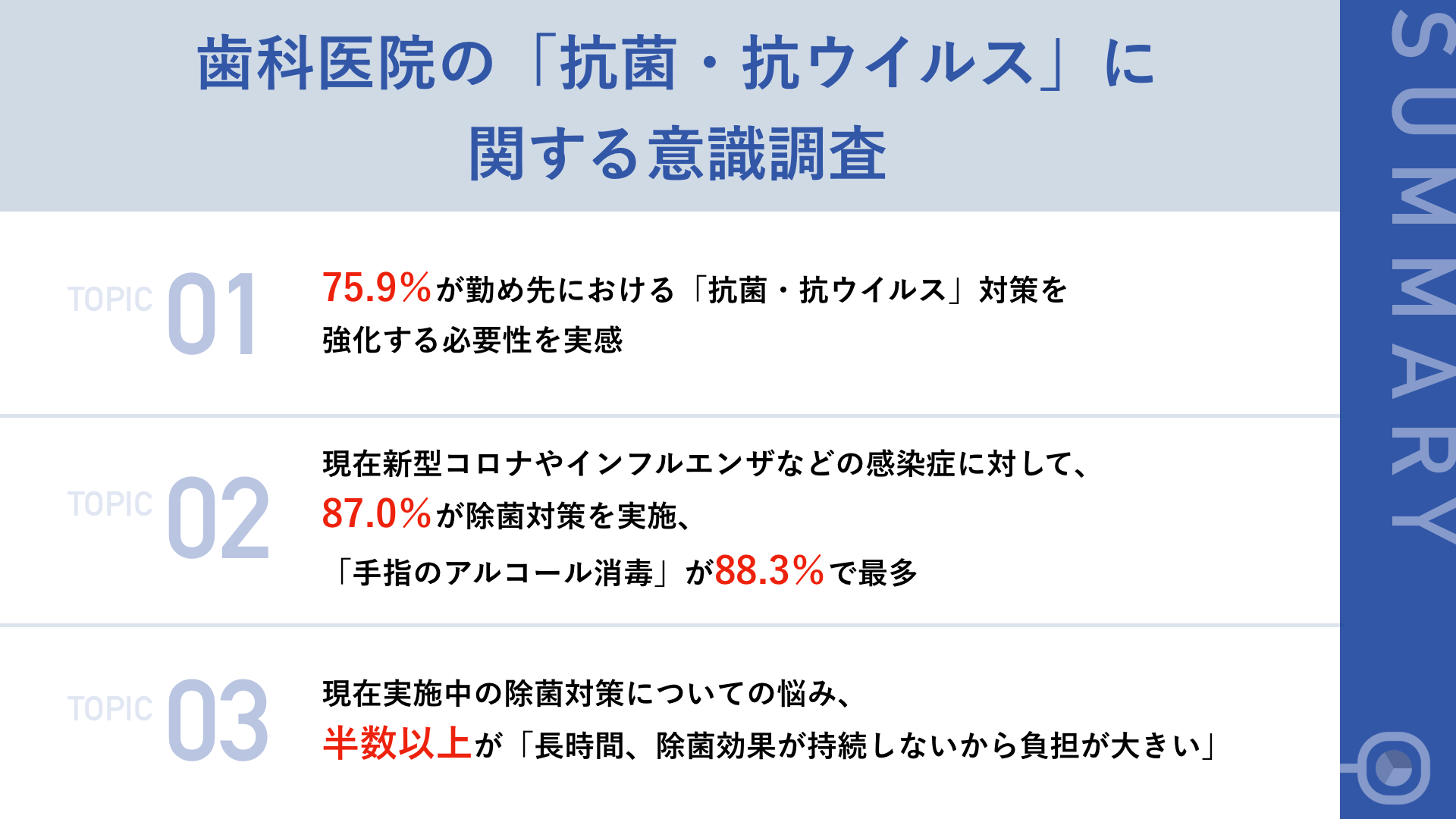 多くの歯科従事者が、「患者からの感染リスクが高い職業だから」や、「歯科医院・診療所の評判に関わるから」などの理由により、現在の勤め先における「抗菌・抗ウイルス」対策を強化する必要性を感じていることがわかりました。また、ほとんどの歯科医院では、手指や機器のアルコール消毒などの除菌対策を実施しているものの、「長時間、除菌効果が持続しないから負担が大きい」などの悩みを抱えていることも明らかになりました。