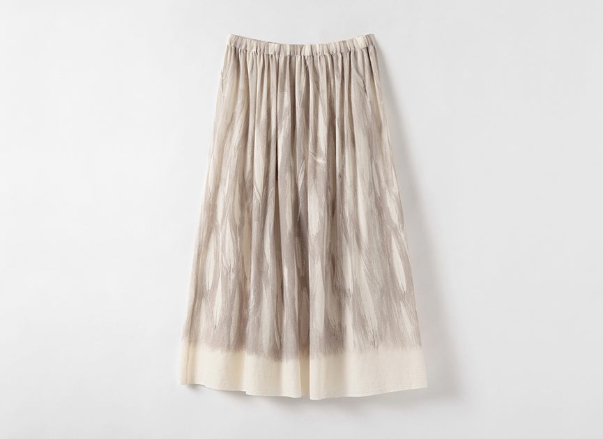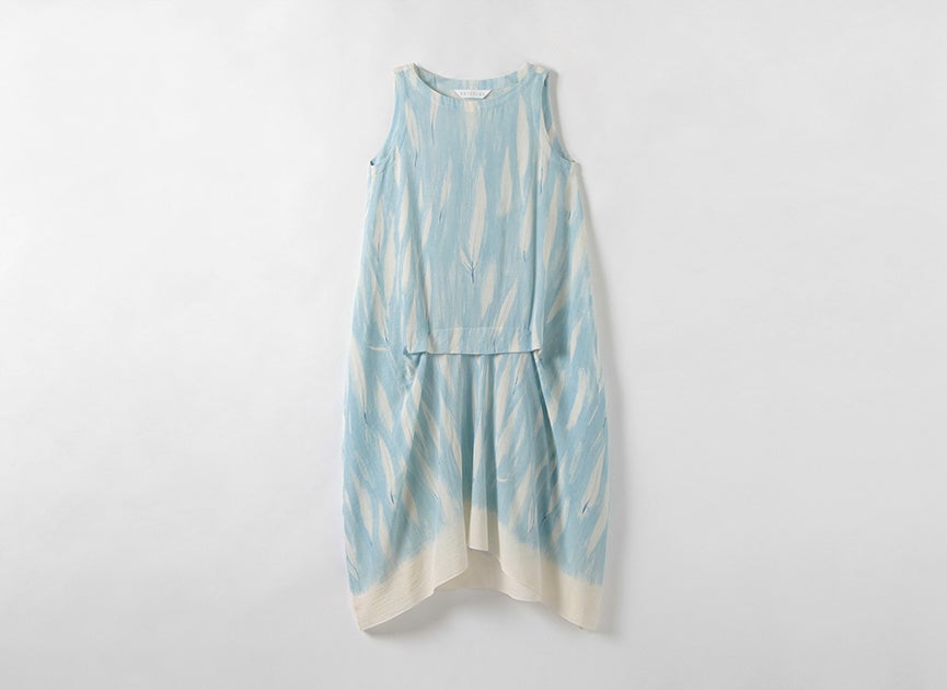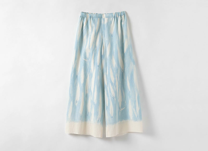 新登場の「笹の葉シリーズ」は、コレクションテーマの「雨土」をイメージし、藍染プリントのブルー、と五倍子染プリント(※1)のグレーを施したシリーズです。涼しげなオーガニックコットンのガーゼに、さらさらと笹の葉がそよぎます。
