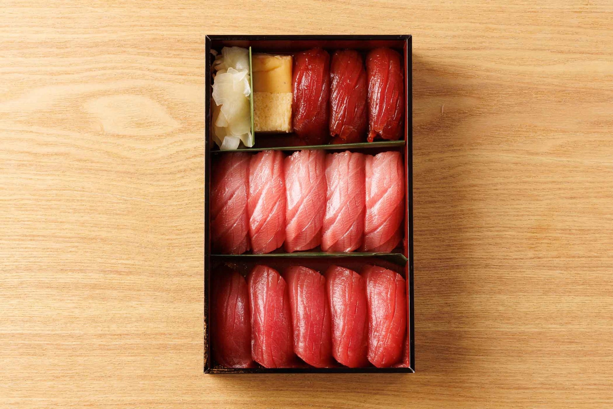 生本鮪のトロ、赤身、漬けの入った13貫の握り折り詰です。