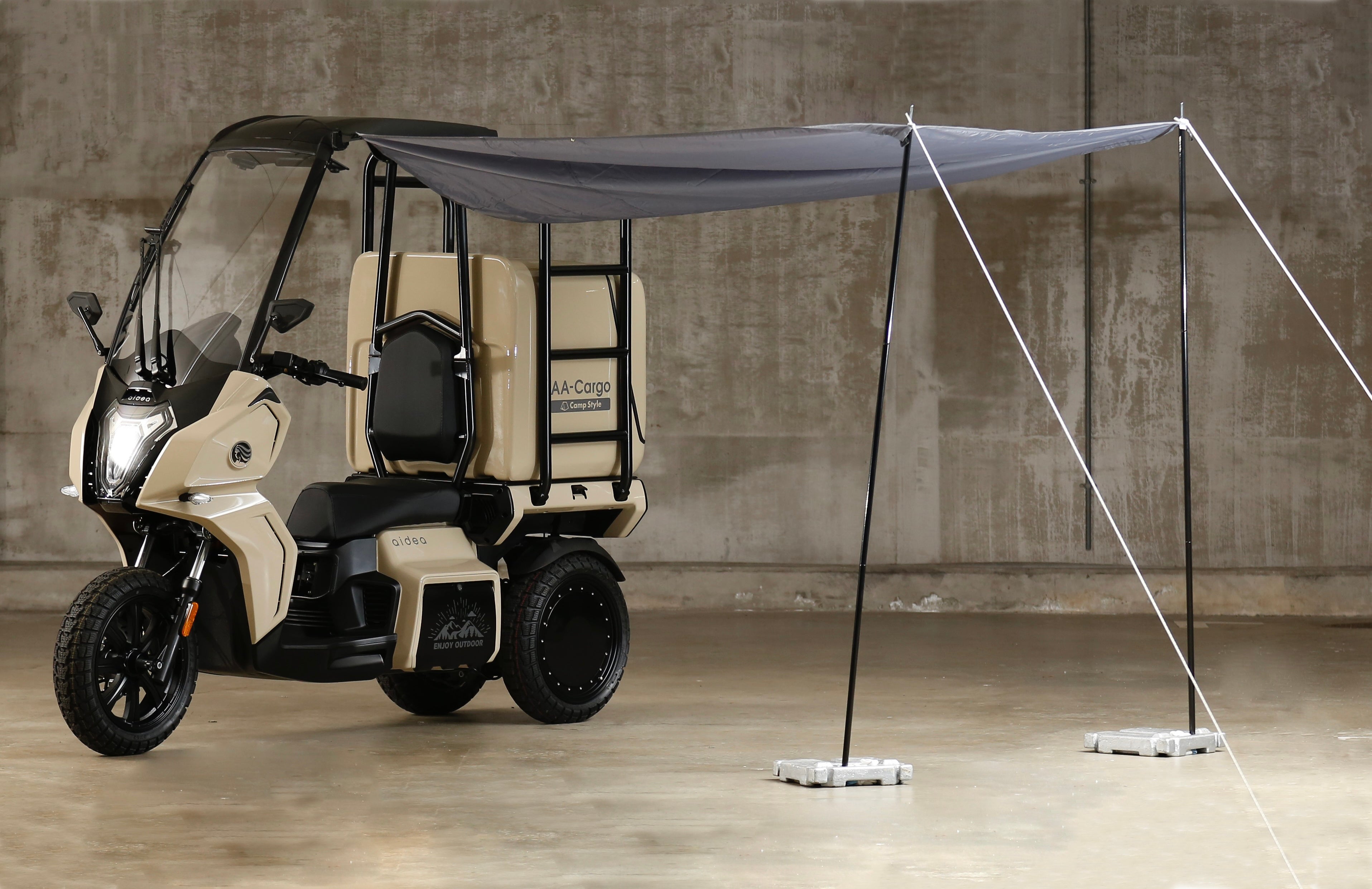 また、電動3輪バイク「AAカーゴ・キャンプスタイル」を一般初公開。100Vコンセントを備えているため、屋外で電気製品を使って快適なキャンプが楽しめます。