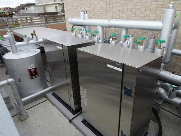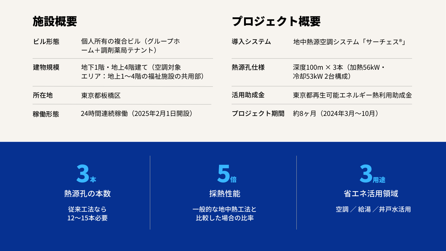 「トックマルット」の地中熱ヒートポンプは加熱56kw、冷却53kwの2台。ほかに冷房の排熱(通常35~40度)を熱交換器で水に伝え、温水をつくる蓄熱槽も備えました。ボイラの燃料や電気代の削減につなげます。また、井戸水を汲み上げて夏場の水まきや防災井戸として活用することも可能です。「トックマルット」は地下1階、地上4階の5階建てで、地下1階にスギ薬局、地上1~4階にはスターツケアサービス株式会社が運営する「グループホームきらら板橋徳丸」がテナントとして入ります。このうち地中熱システムを利用するのは、グループホームきらら板橋徳丸となります。