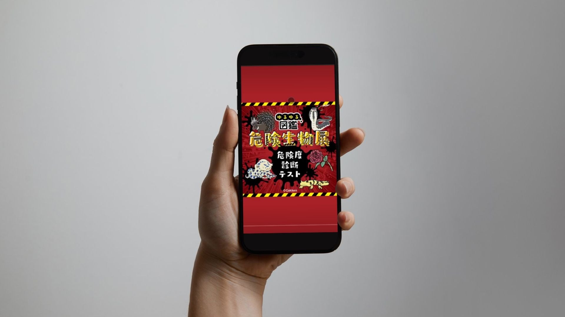 「危険度診断テスト」は、来場者が6つの簡単な質問に答えるだけで、自身の「危険度」を危険生物に例えて診断できるという体験型アトラクションです。診断結果は、危険生物なのにゆるっとかわいいイラストと、それに合わせたテキストで表示され、来場者の笑いを誘っていました。