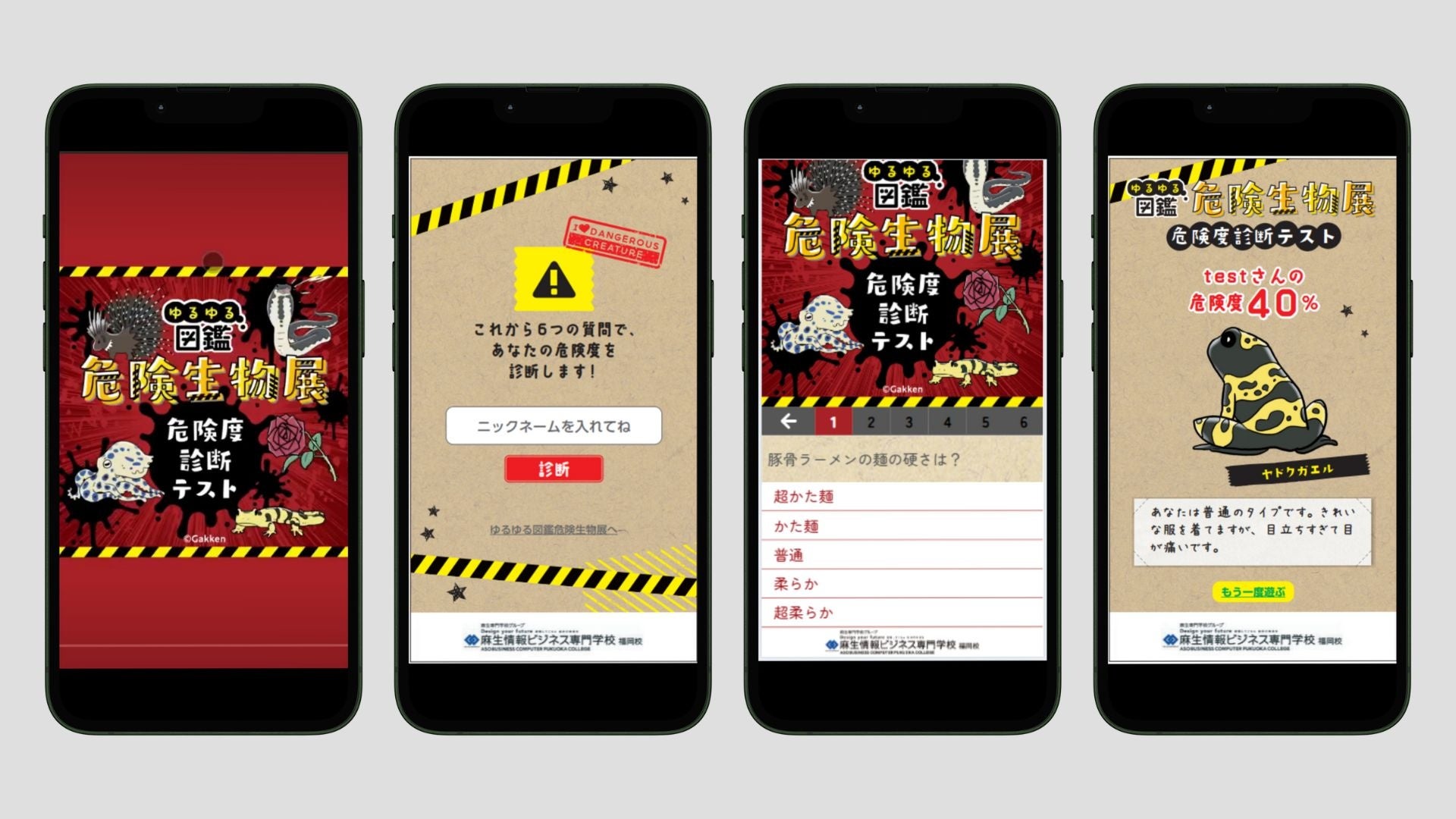 この展示のアトラクションの一つである「危険度診断テスト」アプリを、麻生情報ビジネス専門学校 福岡校 情報工学科3年生の学生が開発しました。
