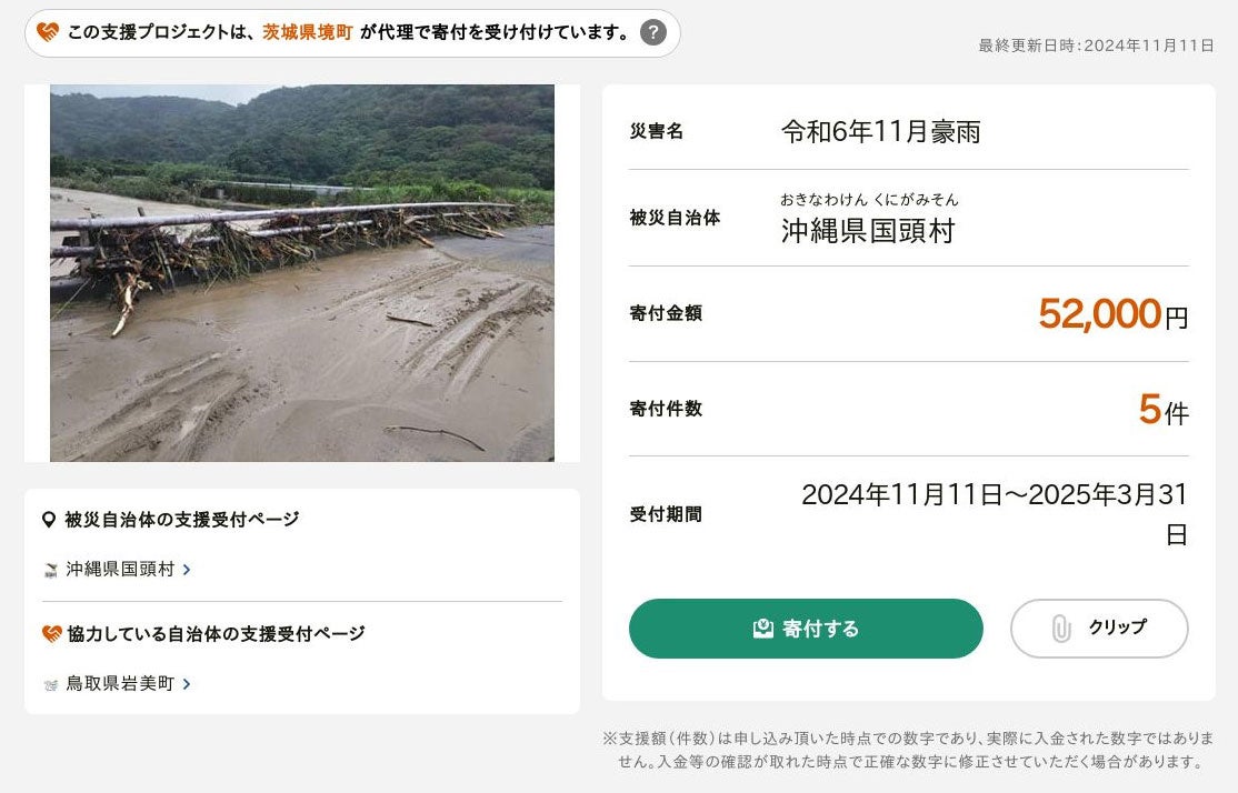 令和6年11月の沖縄豪雨においても、かねてより交流のある沖縄県国頭村の代理納税を11月11日より開始しています。皆様のご支援をよろしくお願い申し上げます。