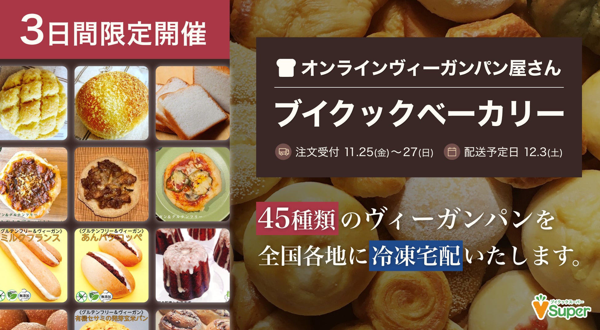 株式会社ブイクック(本社:神戸市/代表:工藤柊)は、2022年11月25日(金)から27日(日)の3日間限定のオンラインヴィーガンパン屋さん「ブイクックベーカリー」を実施いたします。45種類のヴィーガンパンを、ご自宅まで冷凍宅配いたします。
