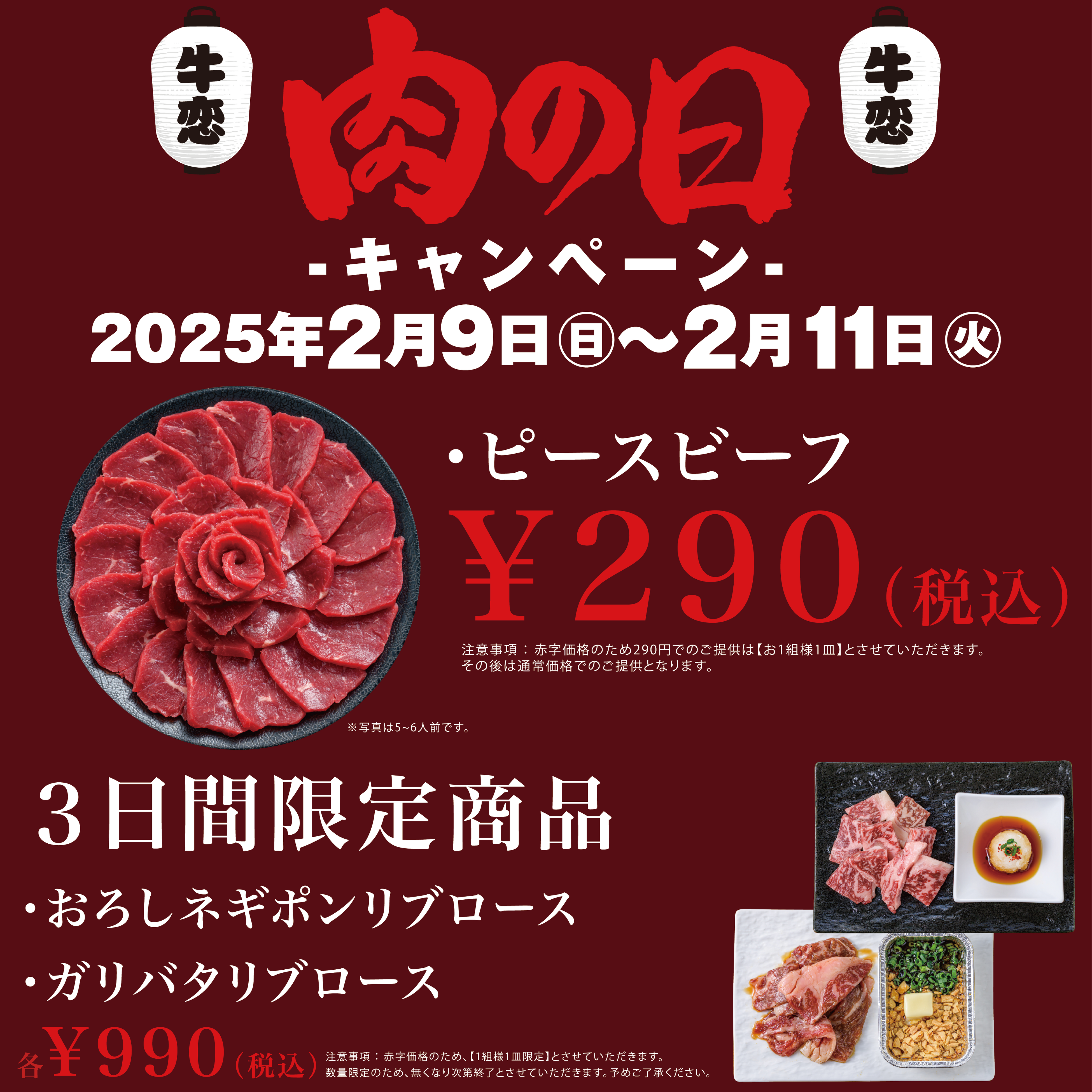 【看板商品ピースビーフ290円&リブロース半額】焼肉屋「牛恋」が年に一度の赤字覚悟“肉の日”キャンペーンを開催。