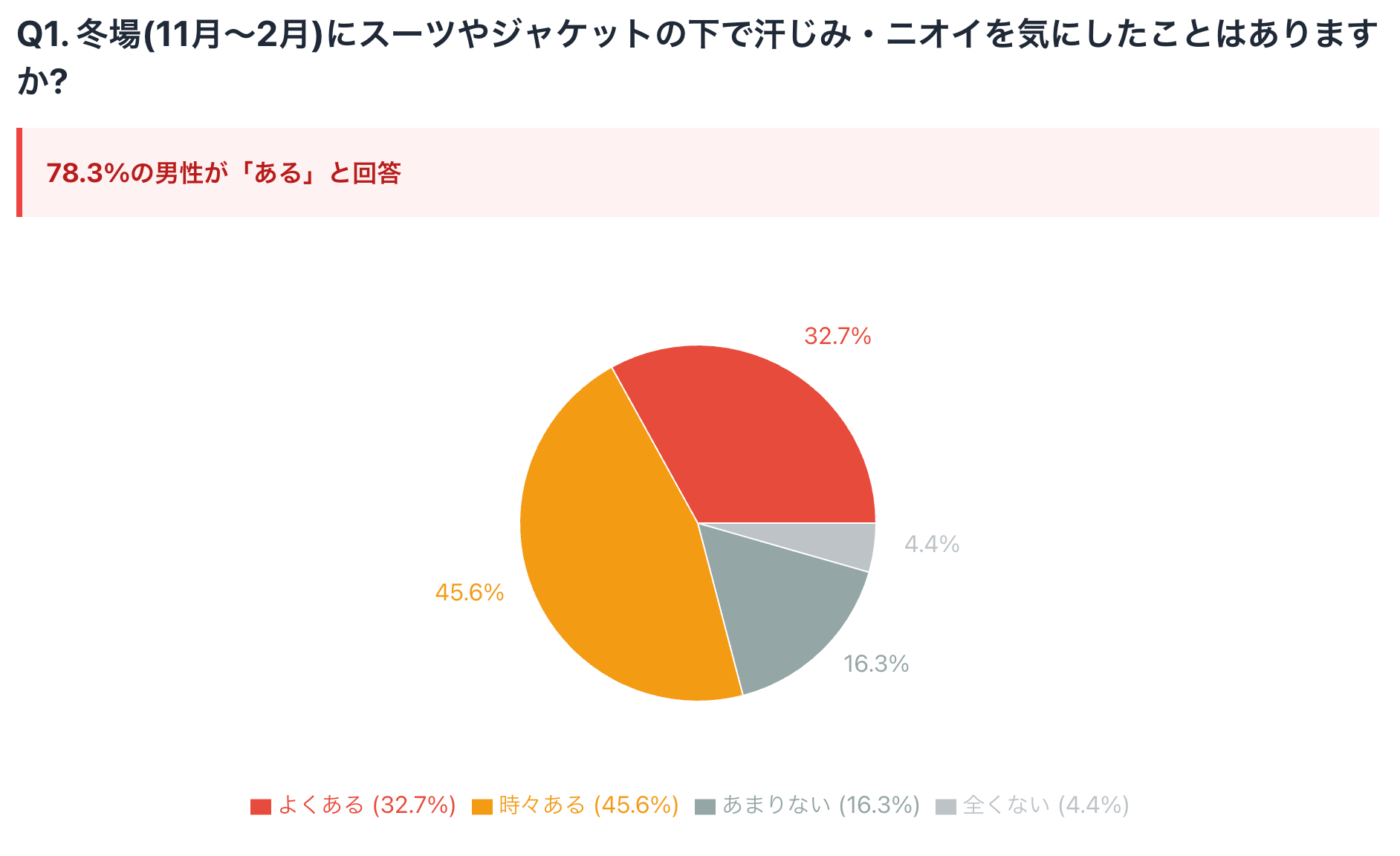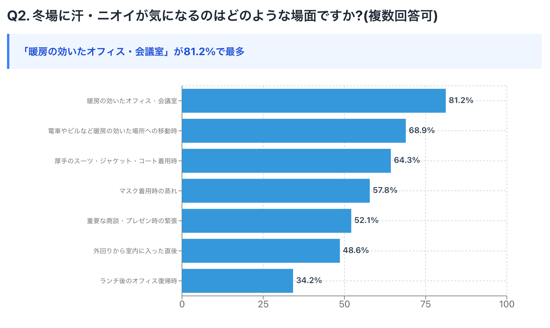 その結果、78.3%の男性が冬場の汗じみ・ニオイを気にした経験があり、特に「暖房の効いたオフィス」「移動時」「厚着」が主な原因となっていることが分かりました。