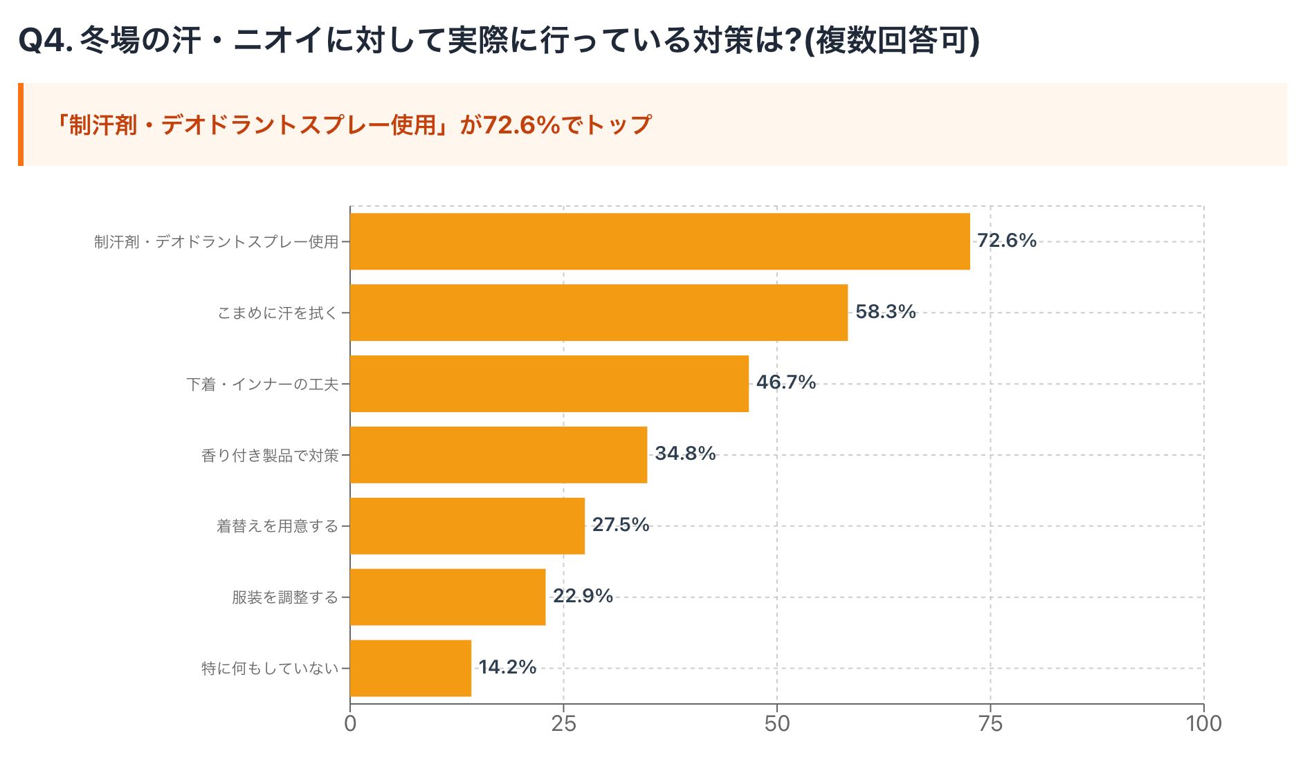 冬場の汗・ニオイに対して、実際にどのような対策を行っているか調査しました(複数回答可)。