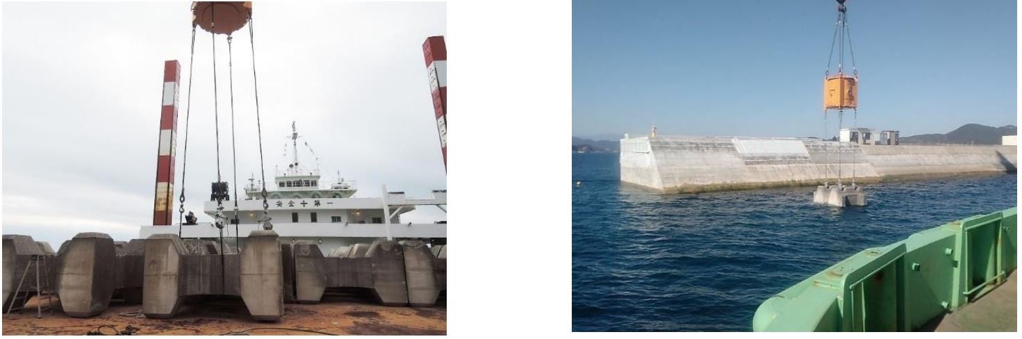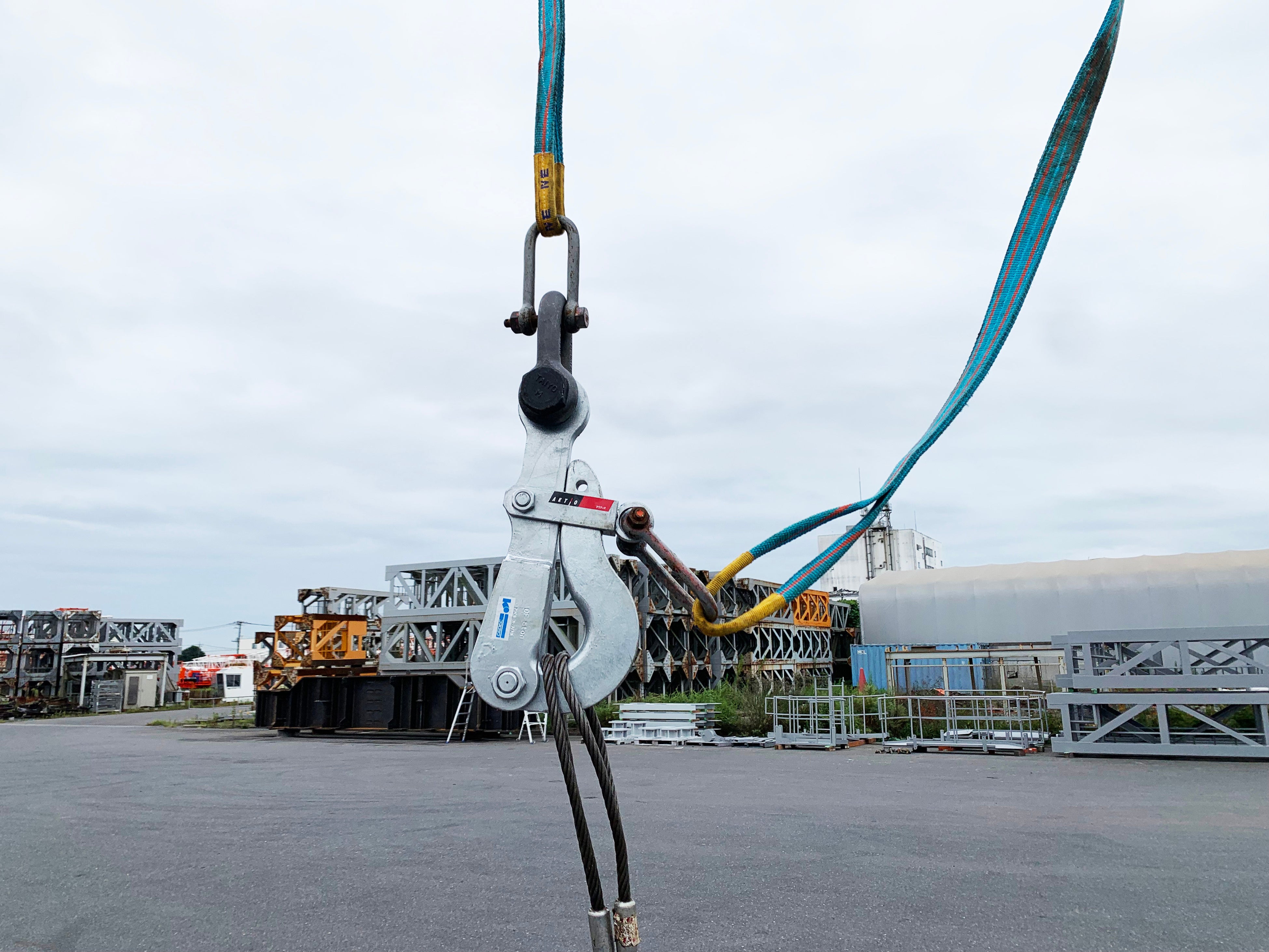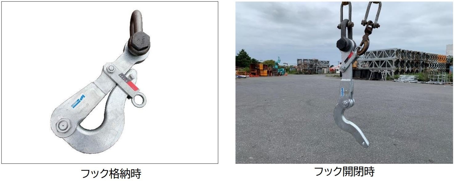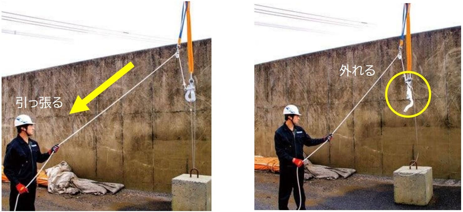 「玉外し装置」は、玉外し作業における安全性と作業効率を高める機械装置です。従来の玉外し作業は、据付場所の近くで作業をするため、転落・墜落事故や吊り荷落下事故など危険を伴う作業でした。この「玉外し装置」は、吊り荷からワイヤーとフックを外す作業を、据付場所から離れた場所で行えるため、安全に効率的に作業を進めることができます。また、水中でも使用可能なため、河川・護岸工事でブロックなどを設置する際も活躍します。