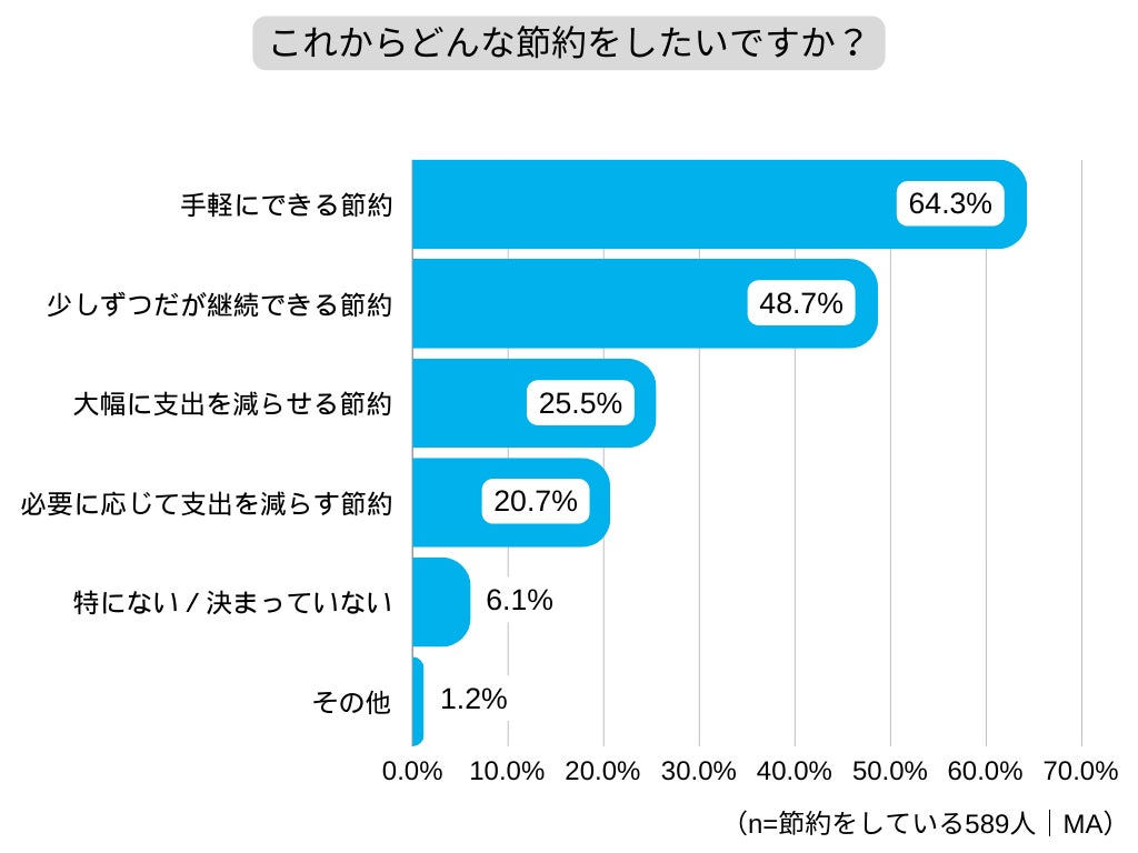 生活防衛策として圧倒的1位になった「節約」について、どんな節約をしたいか聞いたところ、1位「手軽にできる節約」64.3%、2位「少しずつだが継続できる節約」48.7%でした。終わりが見えないモノやサービスの値上がりの中で、手間をかけずに続けられる節約が大切と考えている人が多いことがわかりました。