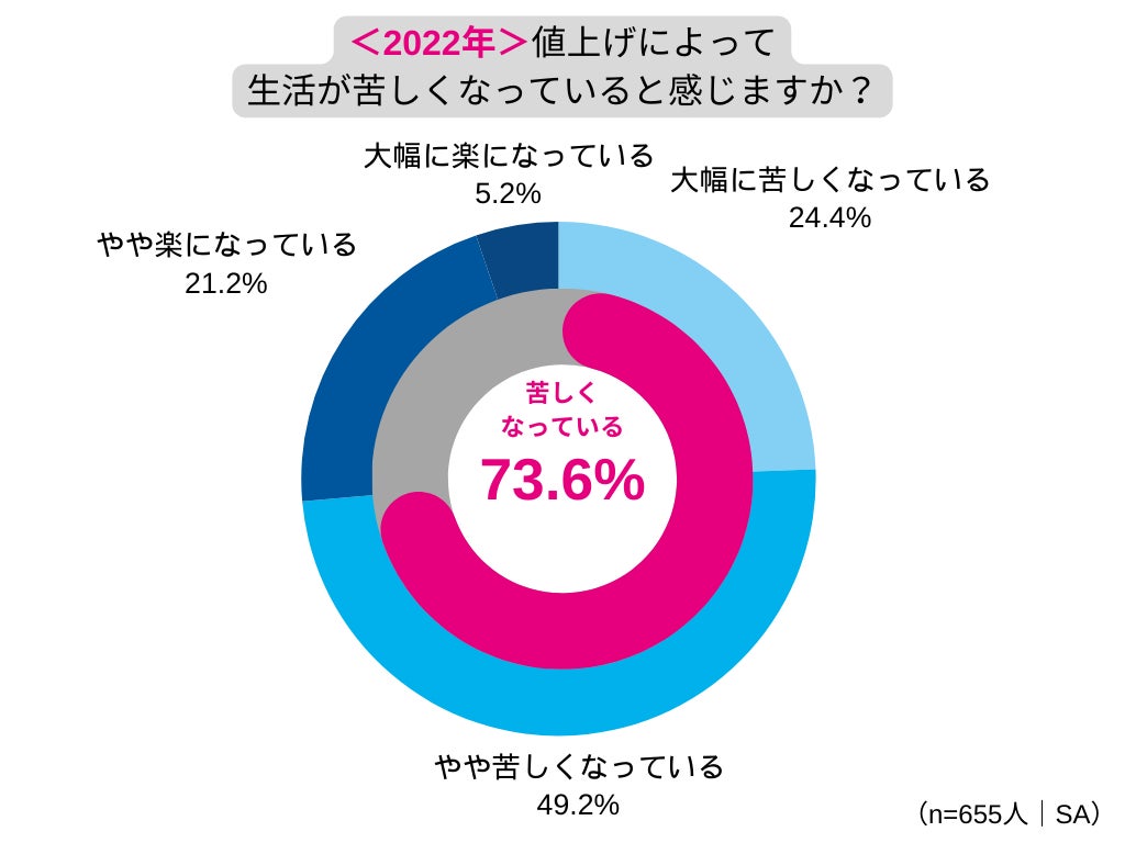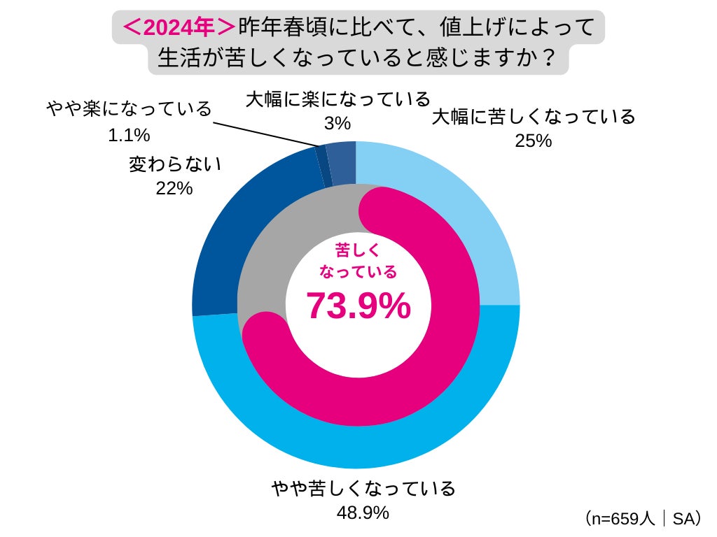 ・2023年春頃に比べて、値上げによってさらに生活が苦しくなっていると感じる人は73.9%、こちらも3年連続で7割以上の人が生活が苦しくなっている