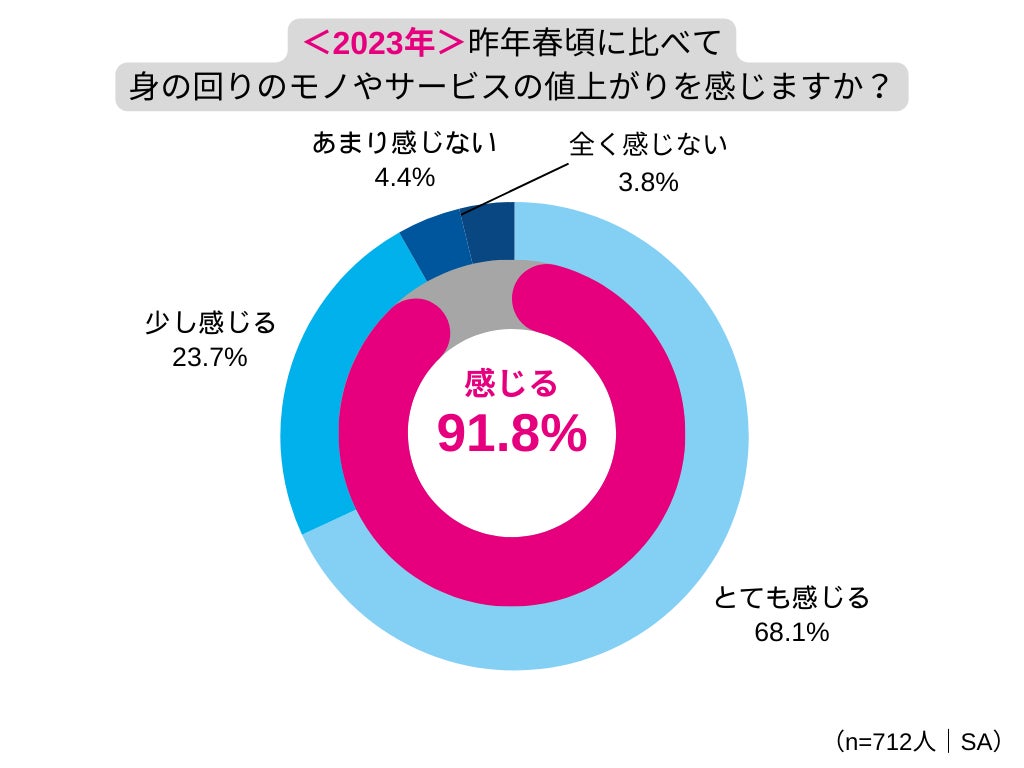 ・2023年春頃に比べて身の回りのモノやサービスについて、値上がりを感じる人は94.1%、3年連続で約9割の人が前年より値上げを感じる