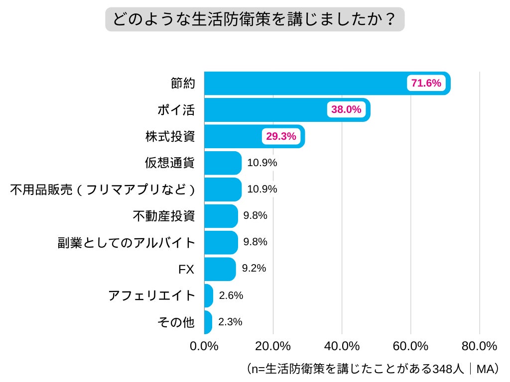 ・生活防衛策は、1位「節約」2位「ポイ活」に続き3位「株式投資」