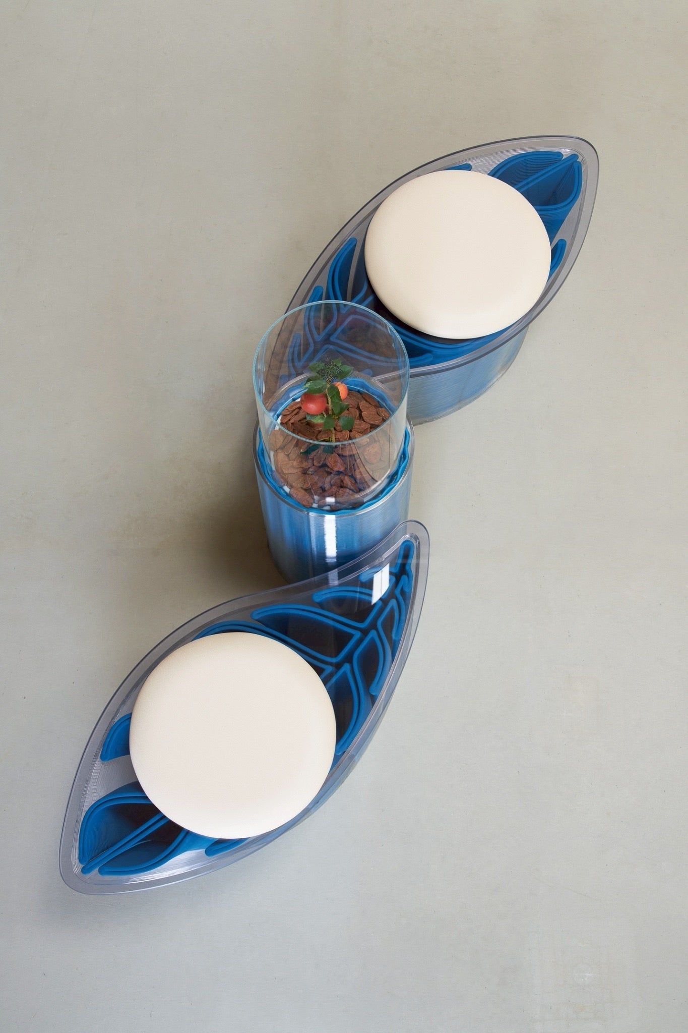 このデザインをベースに、ExtraBoldにてプロジェクトマネジメントを行いながら、弊社にてMOFの材料混合した樹脂材料(青い部分)を開発し、相合家具のご協力で設計・製作しました。