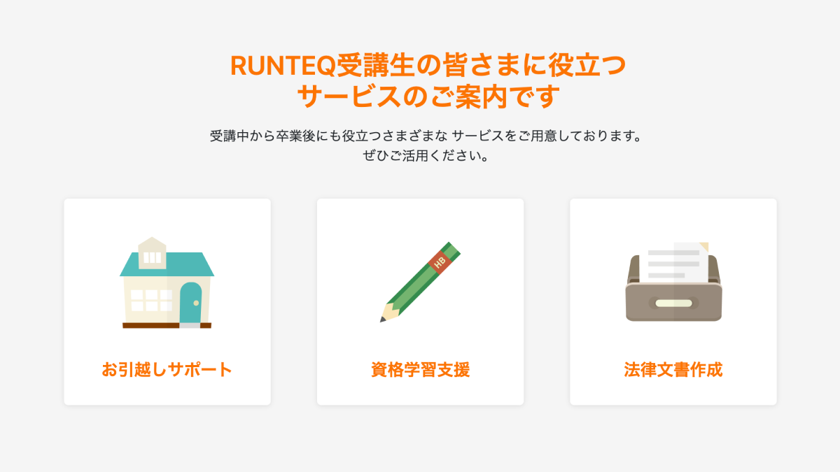 RUNTEQをご受講いただいている皆さまは、RUNTEQ Supportにログインすることで、お引越しサポートを始めとする様々な支援をご利用いただけます。