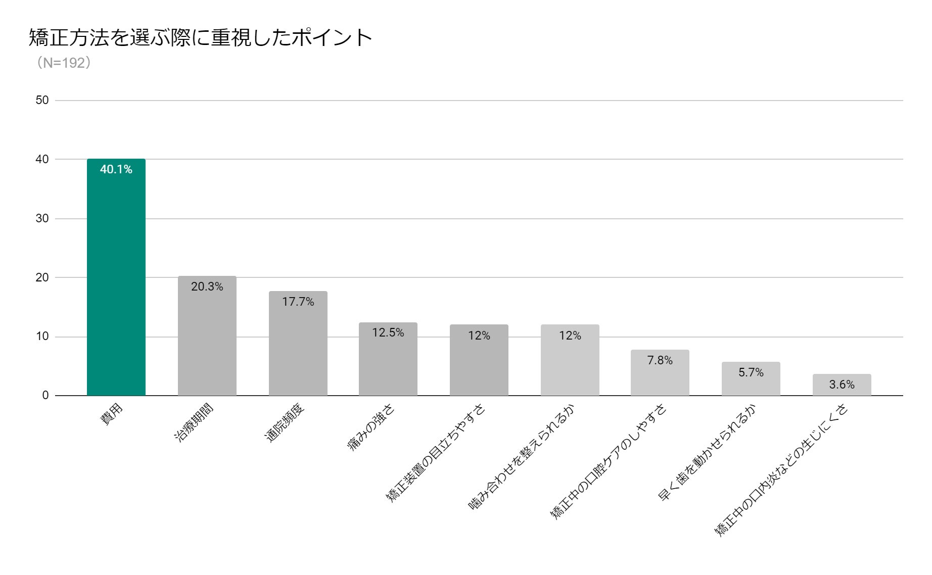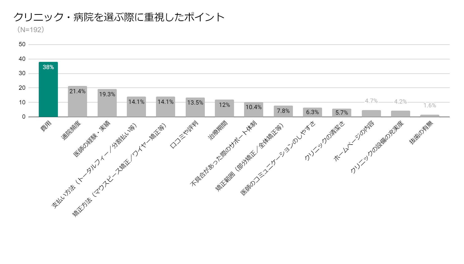 調査の結果、「クリニック・病院を選ぶ際に重視したポイント」と「矯正方法を選ぶ際に重視したポイント」と「歯科矯正をしているときに不満に感じたこと」でも、「費用」が最も多い結果となりました。歯科矯正を実施する方にとって、「費用」が最も重要な項目であることが見受けられます。