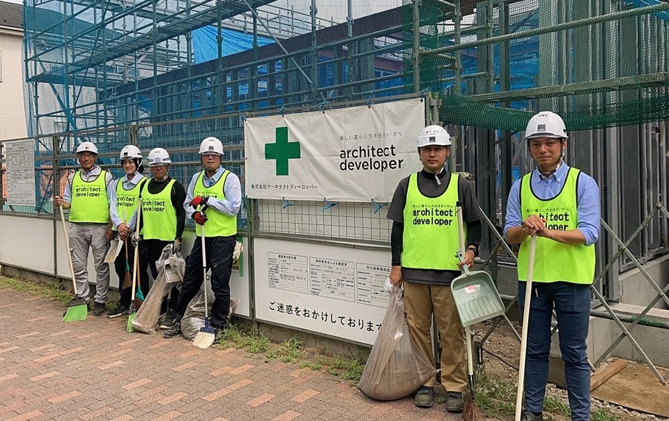 また、当社は経営理念のひとつに「そのマチとヒトの未来を公共心をもって紡ぐ」を掲げています。その土地・建物だけではなく、建物周辺の地域や近隣にお住いの方々の未来を考えた計画を立案することを使命としており、その取り組みのひとつとして、清掃活動を継続しています。