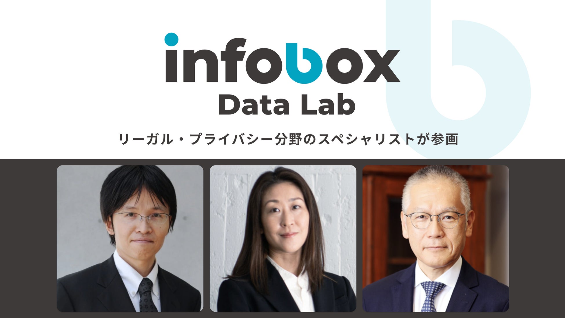 infobox Data Labは、安全・安心なデータ利活用を目指す企業に対して、日本国内におけるデータ利活用のあるべき姿を提案します。基本的な方向性として、法令を遵守することのみならず、①データの取得と利用の各フェーズにおいて透明性と本人の選択を重視し、②本人に不利益や差別をもたらすような利用を回避します。そうすることによって、プライバシー侵害を回避し、社会や顧客からの信頼を確保することにつながると考えるからです。infobox Data Labにご期待ください。