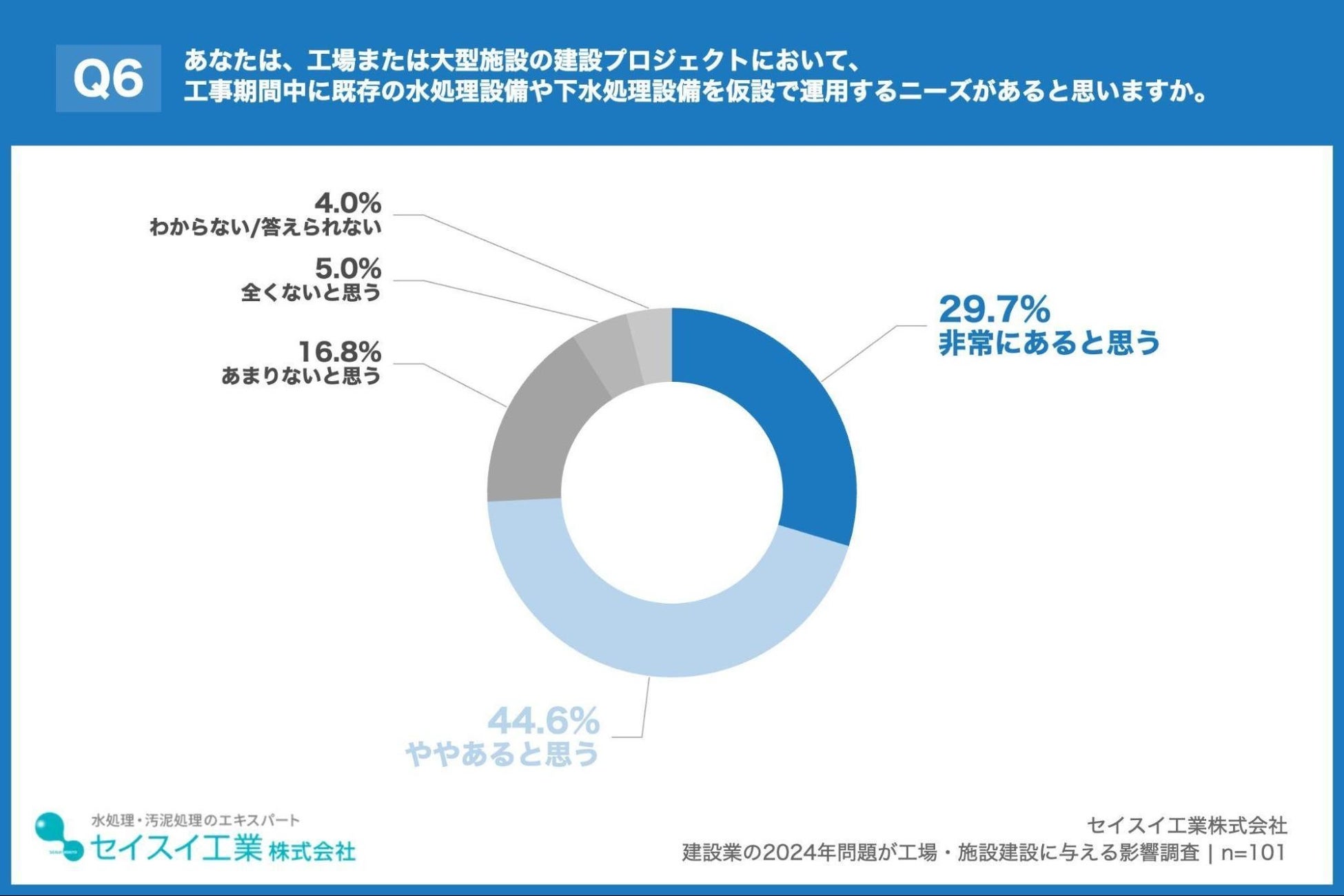 「Q6. あなたは、工場または大型施設の建設プロジェクトにおいて、工事期間中に既存の水処理設備や下水処理設備を仮設で運用するニーズがあると思いますか。」(n=101)と質問したところ、「非常にあると思う」が29.7%、「ややあると思う」が44.6%という回答となりました。