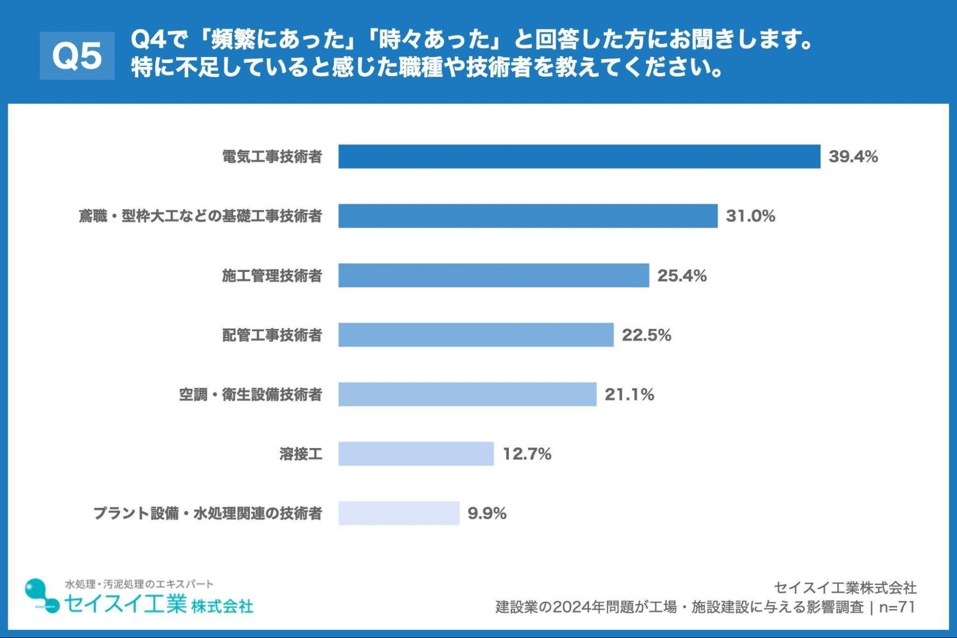 「Q5. Q4で「頻繁にあった」「時々あった」と回答した方にお聞きします。特に不足していると感じた職種や技術者を教えてください。(複数回答)」(n=71)と質問したところ、「電気工事技術者」が39.4%、「鳶職・型枠大工などの基礎工事技術者」が31.0%、「施工管理技術者」が25.4%という回答となりました。