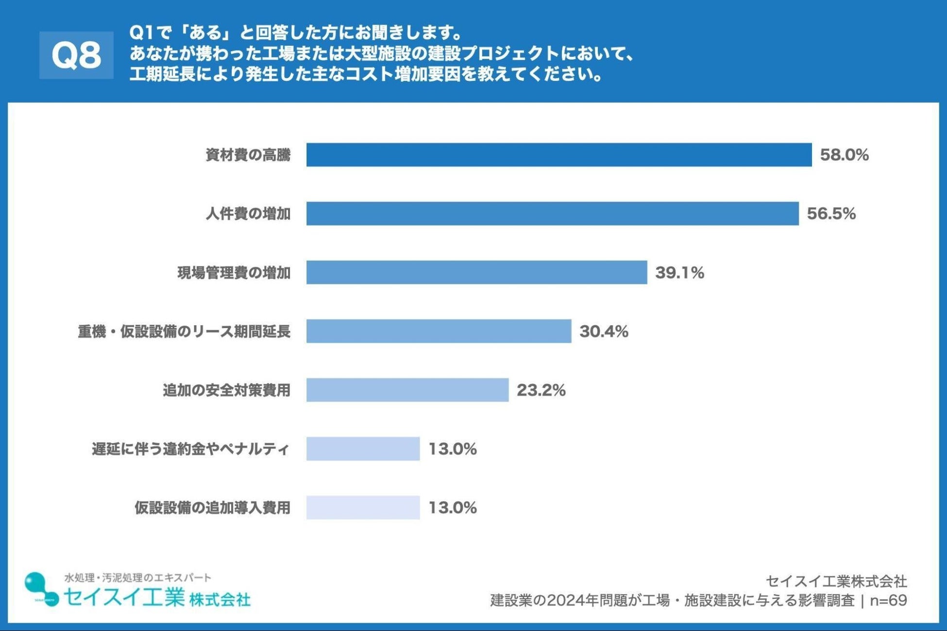 「Q8. Q1で「ある」と回答した方にお聞きします。あなたが携わった工場または大型施設の建設プロジェクトにおいて、工期延長により発生した主なコスト増加要因を教えてください。(複数回答)」(n=69)と質問したところ、「資材費の高騰」が58.0%、「人件費の増加」が56.5%、「現場管理費の増加」が39.1%という回答となりました。