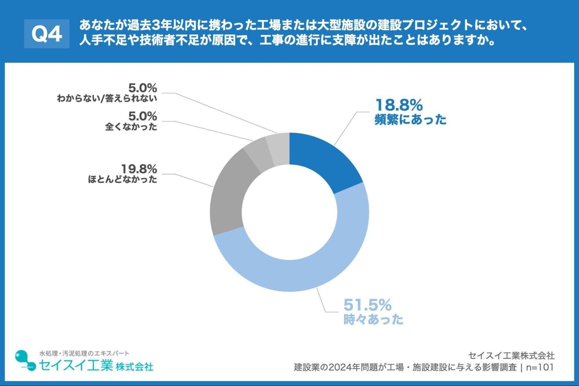 「Q4. あなたが過去3年以内に携わった工場または大型施設の建設プロジェクトにおいて、人手不足や技術者不足が原因で、工事の進行に支障が出たことはありますか。」(n=101)と質問したところ、「頻繁にあった」が18.8%、「時々あった」が51.5%という回答となりました。