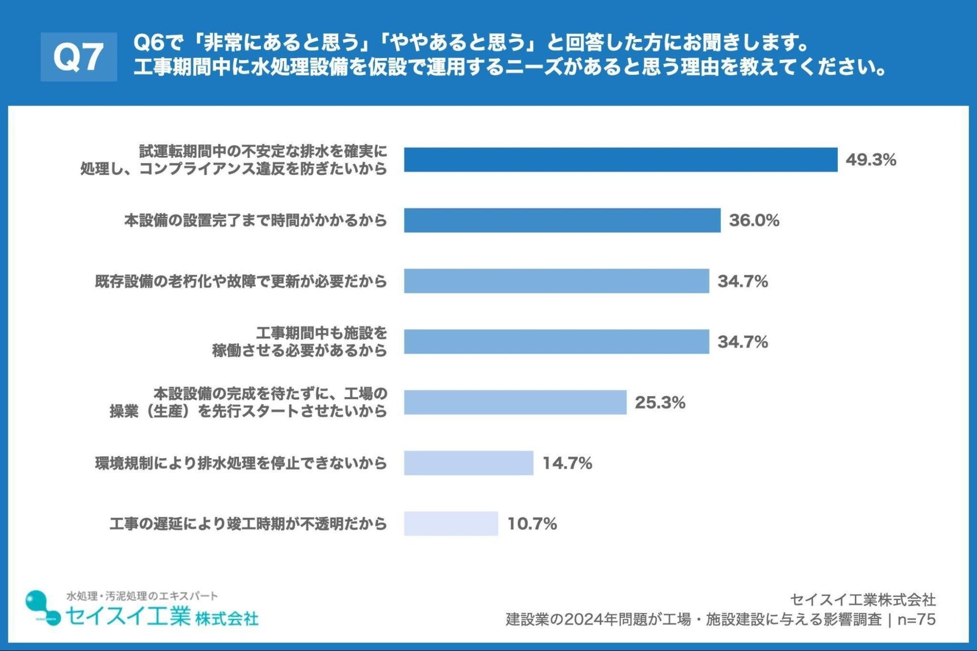 「Q7. Q6で「非常にあると思う」「ややあると思う」と回答した方にお聞きします。工事期間中に水処理設備を仮設で運用するニーズがあると思う理由を教えてください。(複数回答)」(n=75)と質問したところ、「試運転期間中の不安定な排水を確実に処理し、コンプライアンス違反を防ぎたいから」が49.3%、「本設備の設置完了まで時間がかかるから」が36.0%いう回答となりました。