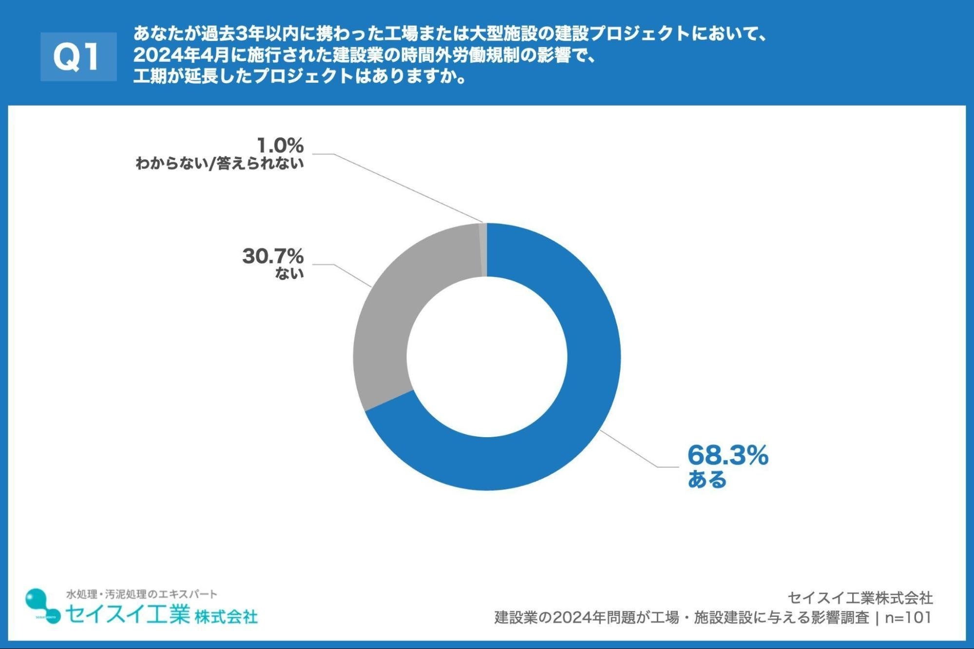 「Q1. あなたが過去3年以内に携わった工場または大型施設の建設プロジェクトにおいて、2024年4月に施行された建設業の時間外労働規制(働き方改革関連法)の影響で、工期が延長したプロジェクトはありますか。」(n=101)と質問したところ、「ある」が68.3%、「ない」が30.7%という回答となりました。