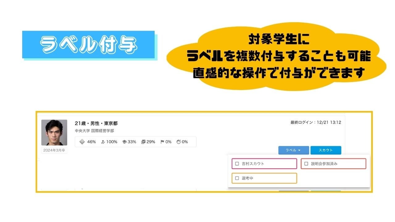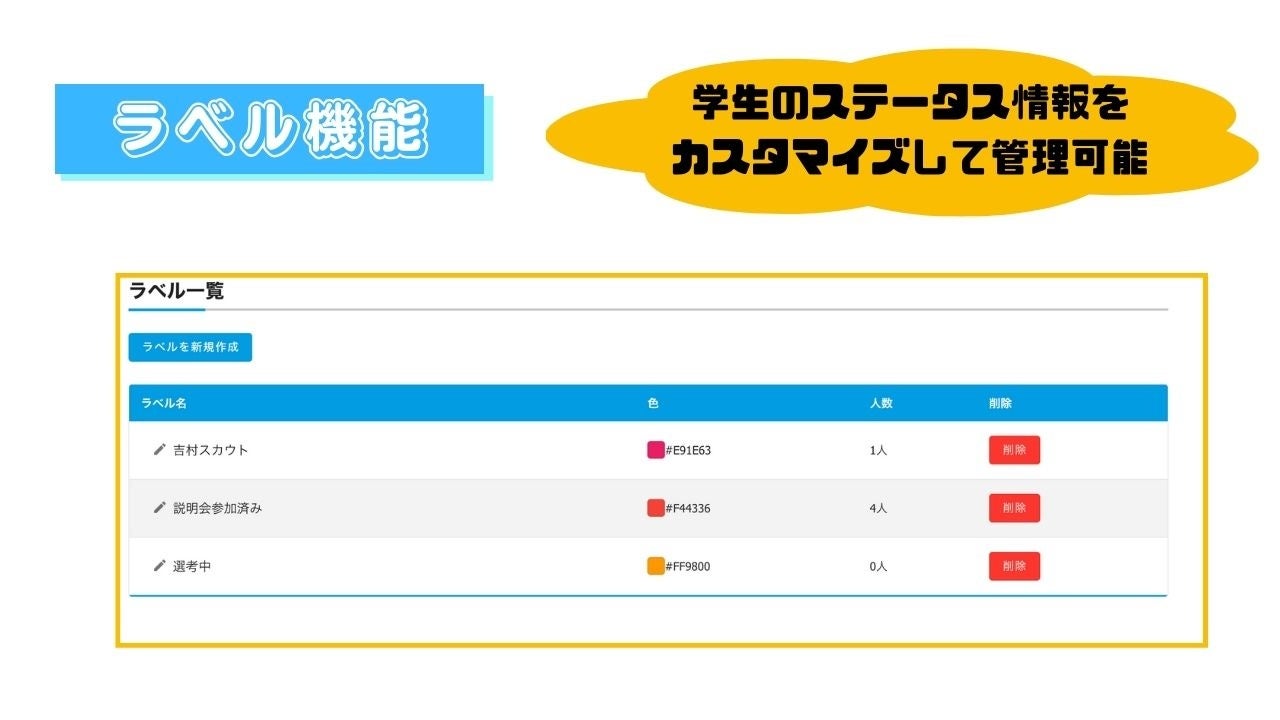 学生一人ひとりにラベルを付与し、企業様に合わせた管理をしやすくすることを実現いたしました。