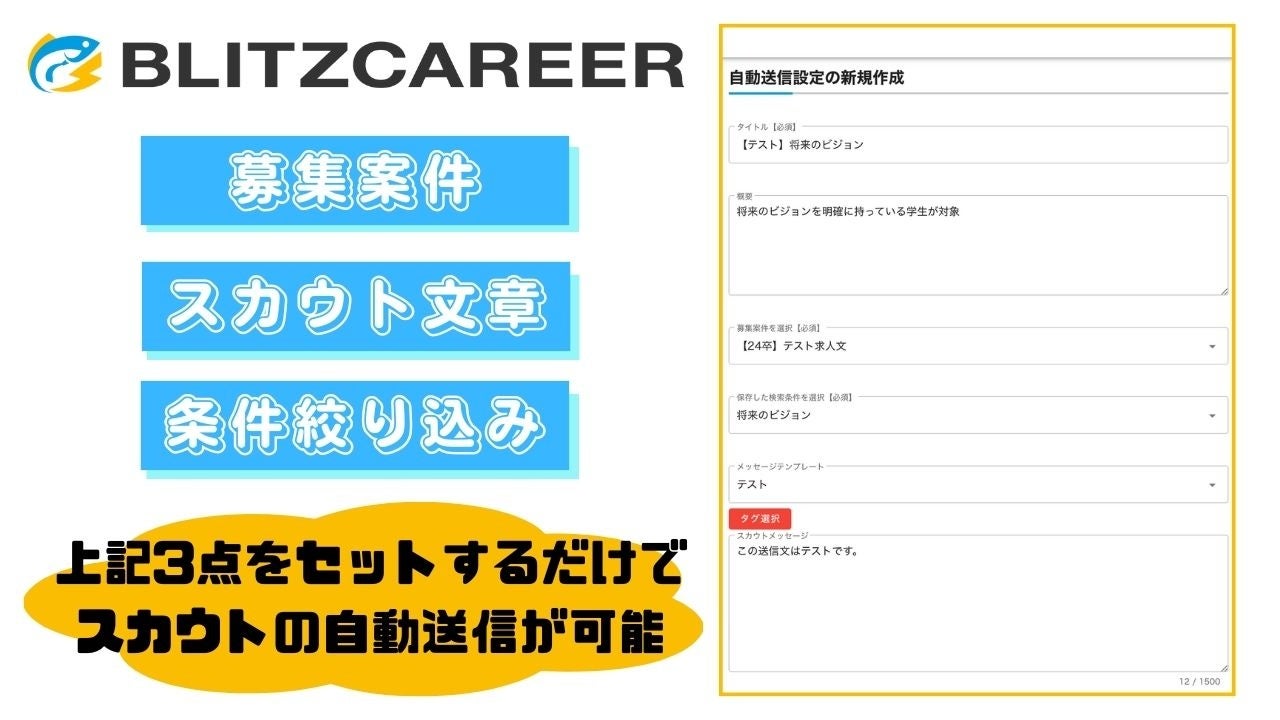 予め設定をした『募集案件』・『スカウト文章』・『条件絞り込み』を登録することで、ターゲットに合致した学生に自動でスカウトを送ることが可能です。