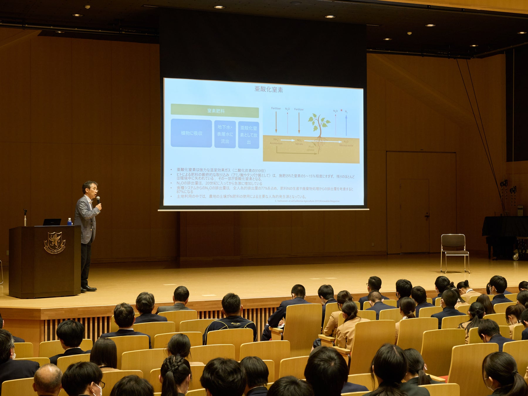 来校いただいたのは、SAAPをご指導いただく、東京大学大学院農学生命科学研究科の河鰭実之教授である。講演名は「未来へのサバイバル!植物工場が挑む食料安全保障とプラネタリーバウンダリー」。会場の宮城野校舎ゼルコバホールには、秀光中学校1〜3年生、仙台育英学園高等学校秀光コース1年生、特別進学コース2年生の理系生徒、そしてせんだいまなびやを選択する生徒の340名以上が集まった。
