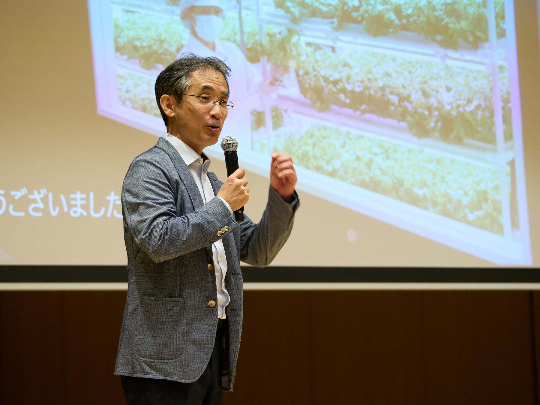 その問題を解決していくための一つの手段が植物工場だと説明。植物工場のメリットについて「植物工場は、成育が速く安定しています。他の植物・生物との競合もなく、栽培しにくい場所でも栽培することができ、予測不能な有害な天候から農作物を守れます。さらに、土地を使わず肥料、水の利用効率が高い点もあります」と語った。