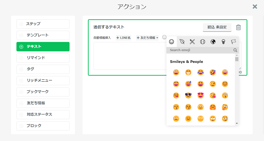エルメアクションから、流入した友だちへのアクション、例えばテキストの送信やリッチメニューの表示、友だち情報の書き換え、といった設定が可能です。