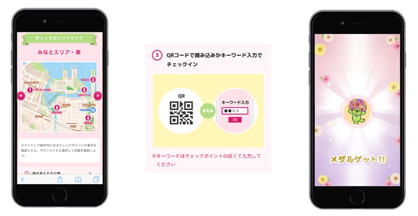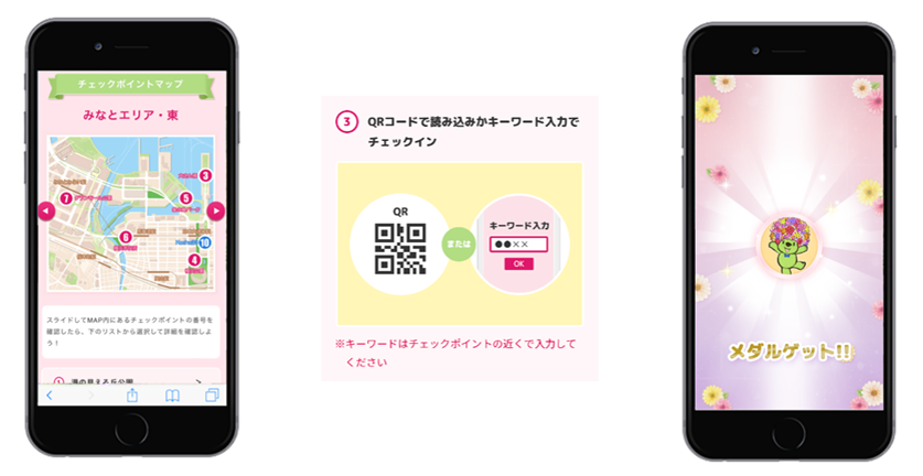 横浜の観光スポットを歩いてメダルを集めよう! チェックポイントでQR コードを読み込むか、キーワードを入力すると、メダルと一緒にガーデンベアがゲットできる!