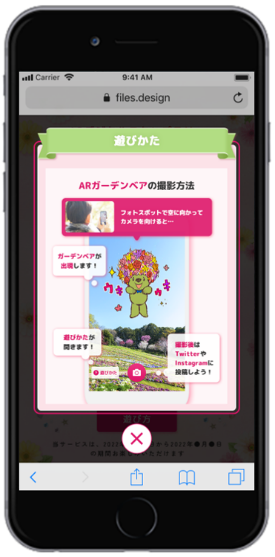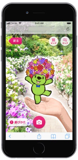 3月26 日(土)~5月8 日(日)の期間中、里山ガーデン(里山 ガーデンフェスタ)では、指定のスポット(大花壇のデッキ)でカメラをかざすと、ガーデンベアが登場する『 AR フォトスポット 』が常設されます。ガーデンベアと一緒に記念撮影をしてSNSなどに投稿することが可能です。
