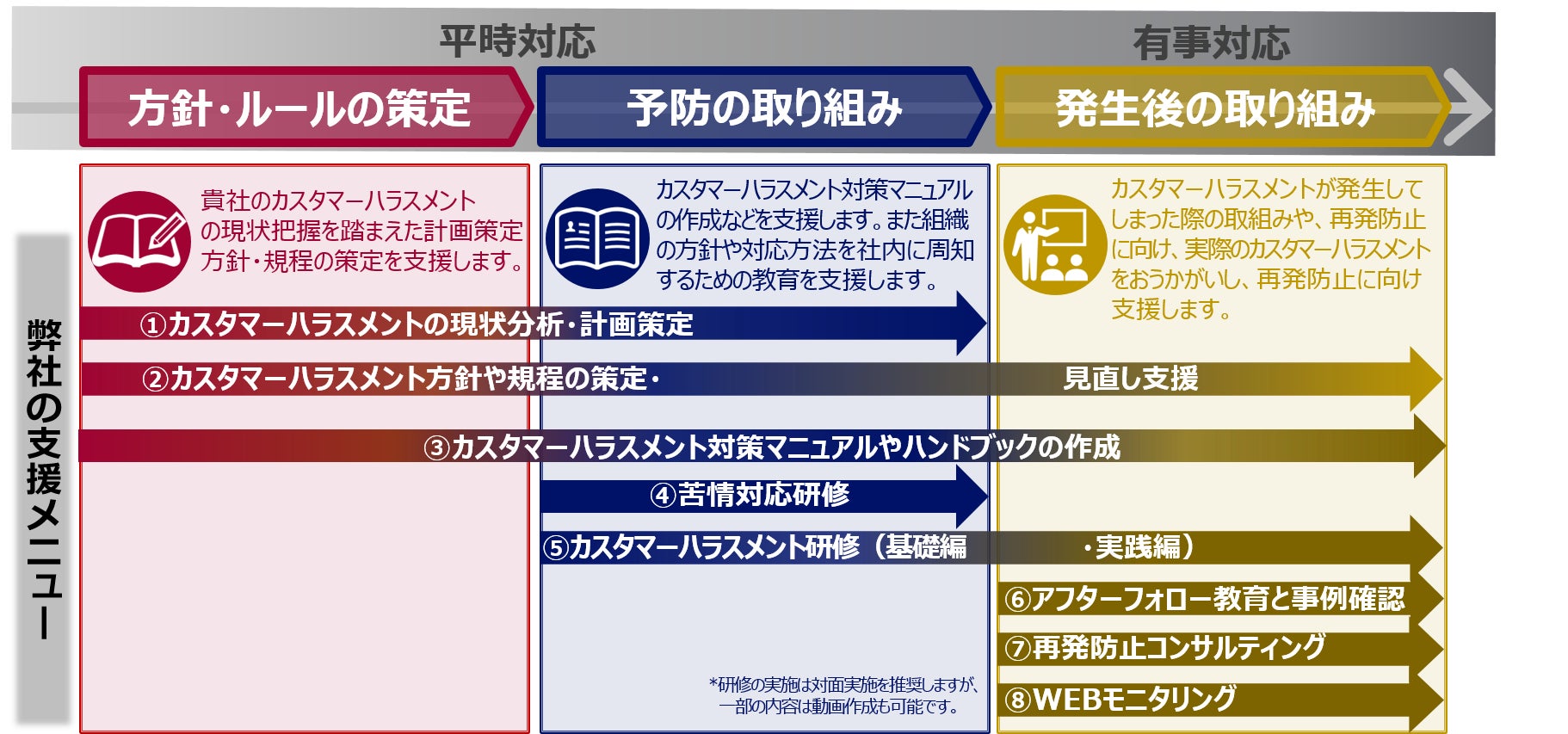 従来から提供するクレーム(苦情)対応コンサルティングで培ってきた実績・経験をもとに、各種メニューを通して、お客さま企業のカスタマーハラスメントのお悩みに寄り添います。